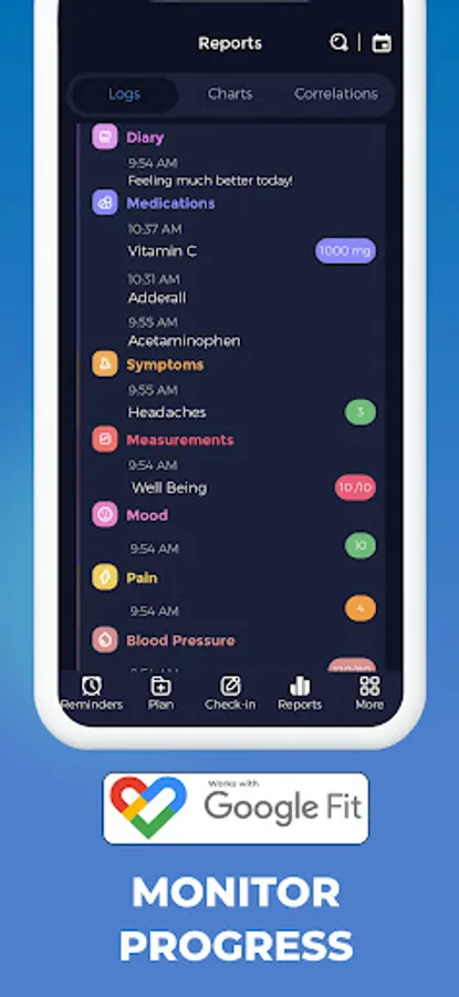π² Trackers included: Track medication (prescription, birth control), vitamins, supplements (such as iron, vitamin C), chronic conditions, symptoms, environmental factors, nutrition, physical activity (such as yoga, steps, exercises), daily vitals & measurements (mood & blood pressure, fever temperature), therapies, sleep, stool tracker, weather tracker & notes. Automatically discover correlations & triggers through reports & insights.