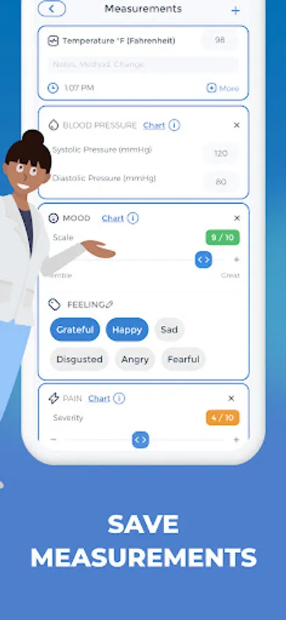 - Pre-set measurements like Weight, Sleep, Blood Pressure, Energy, Productivity, Mood, Pain, Pulse & Temperature, more