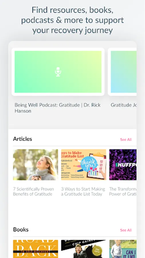 * Recovery Content: Explore videos, podcasts, and articles to help you as progress in your recovery.