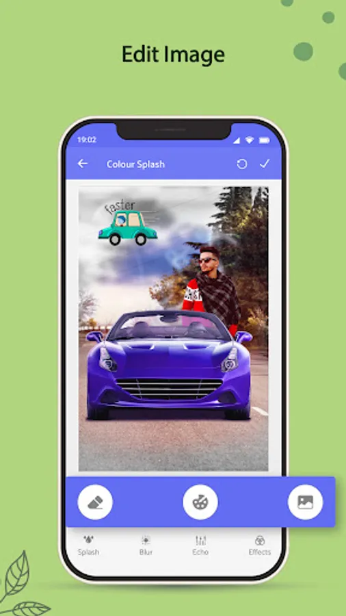 You can also add the splash color on the car photo background and blur the image. Add the echo effect to the car background. You can select a photo from the phone's gallery or take it from the camera. Select the echo frames and set them on the car photo background.