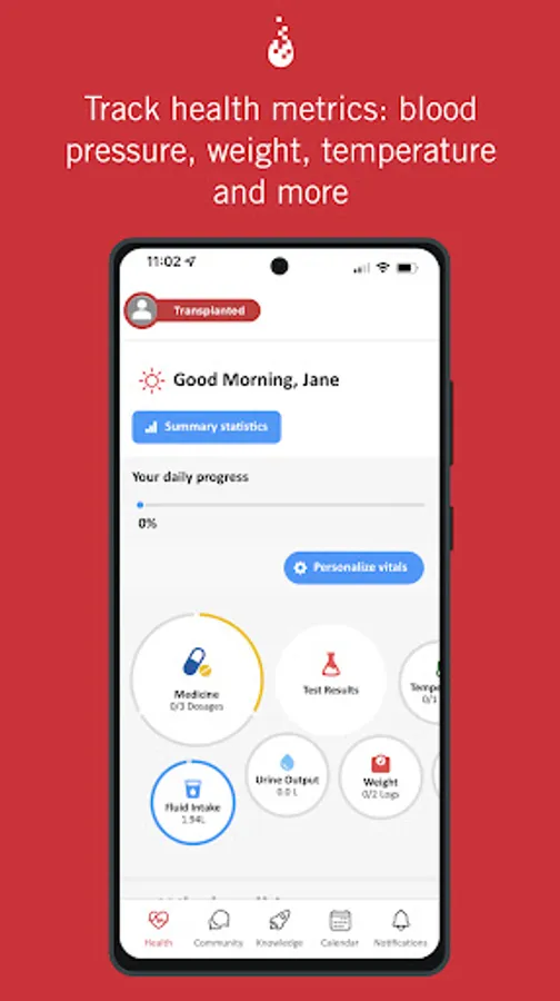 Whether you’re a new or seasoned transplant recipient, AlloCare can make managing your day-to-day health easier. Manage medications, track fluids, blood pressure, temperature, steps, pulse Ox, blood sugar, sleep, and mood -- all in one place.