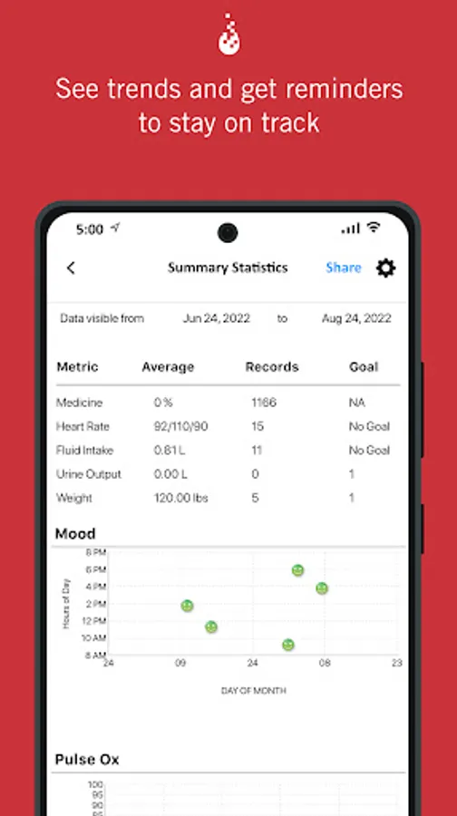 • Track fluids, blood pressure, steps, weight, temperature blood sugar, pulse ox, sleep, and mood