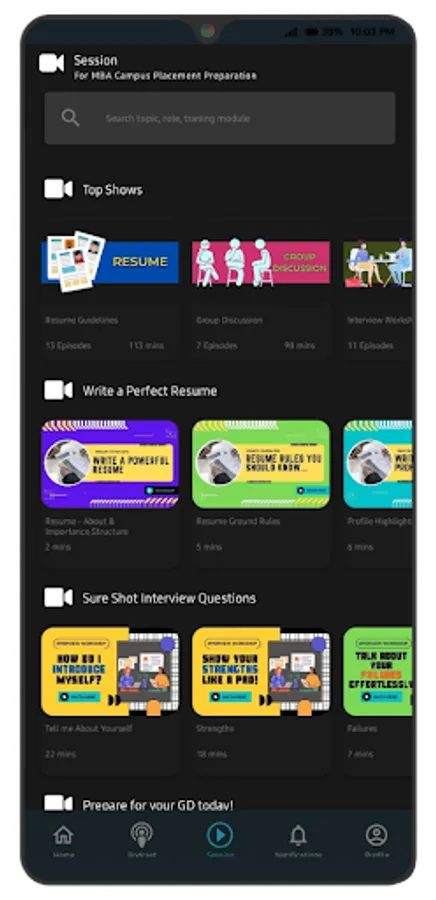 4)Watch sessions: The app includes pre-recorded videos to help you prepare for placements. You can learn how to write a better resume, pick up the nitty-gritty of group discussions, or prepare for some of the most well-known interview questions. Detailed guidelines and frameworks are provided to help you create strong answers.