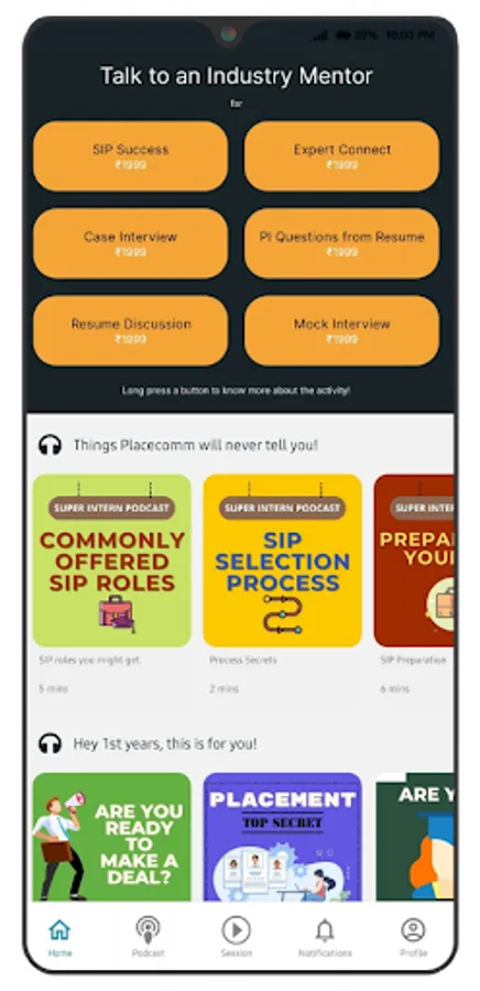 If you're a B-School student getting ready for campus placements, you need the best mobile app to help you out. Our app offers enriching 1:1 sessions with industry mentors graduated from top B-Schools (IIMs, XLRI, FMS, MDI, etc.) and have over 11 years of post-MBA experience. These mentors can help you prepare for interviews, analyze your resume, and nail your summer internship. Additionally, you can access podcasts and videos exlclusively created for MBA student for last-minute preparations.