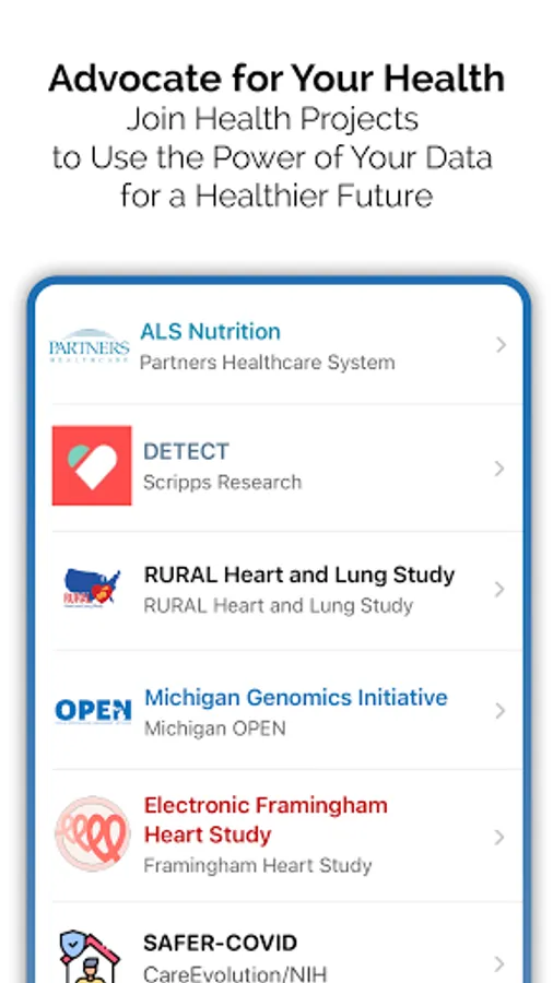 Connect data from your Google Fit and Fitbit, retrieve your medical records, and participate in health projects such as: