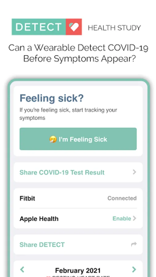 • DETECT Health Study. To help scientists spot viral outbreaks, use MyDataHelps to share any symptoms you may have, and also provide data like your resting heart rate, if you have a wearable device from companies like Fitbit, Withings, and others.