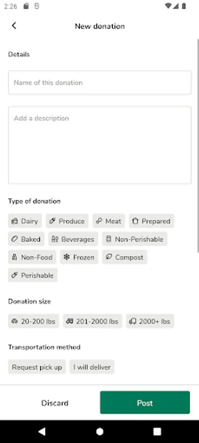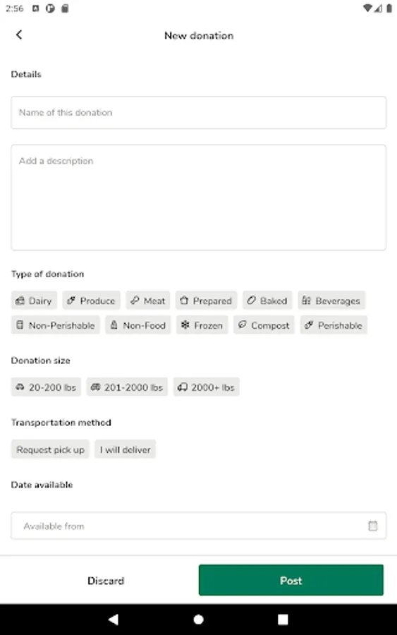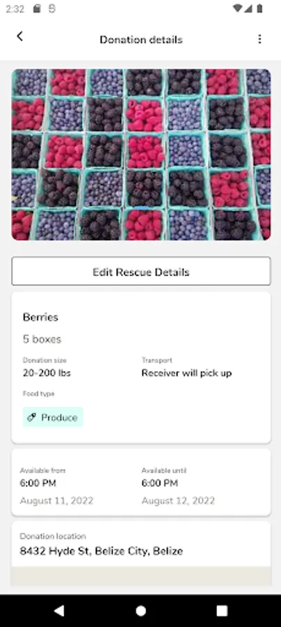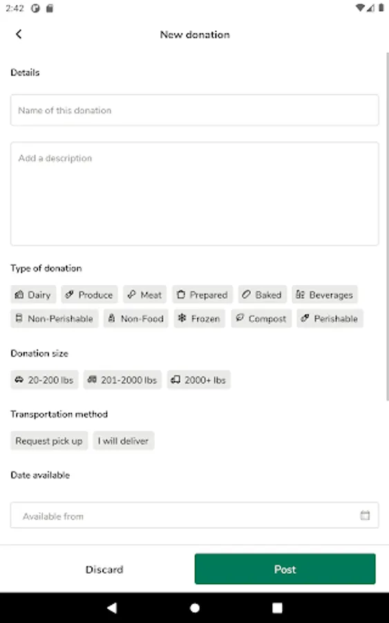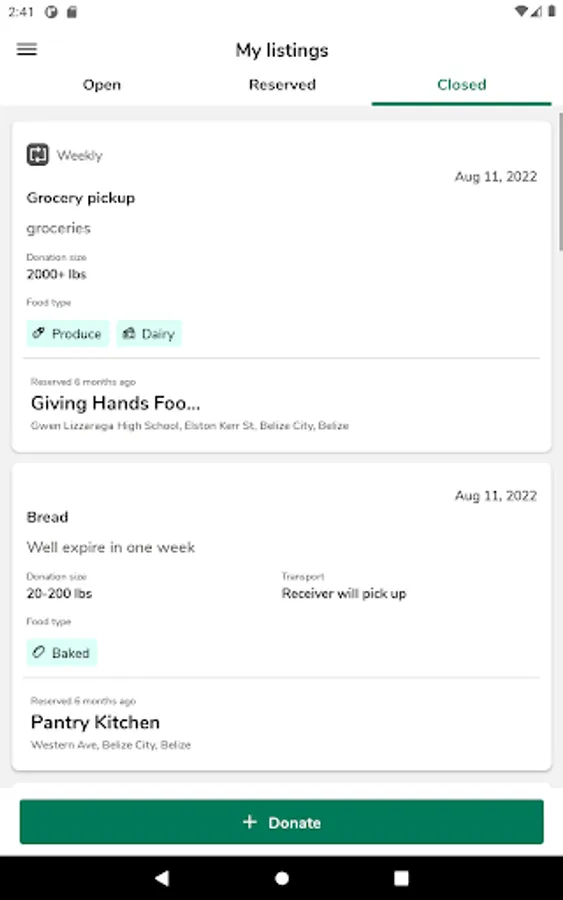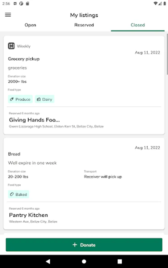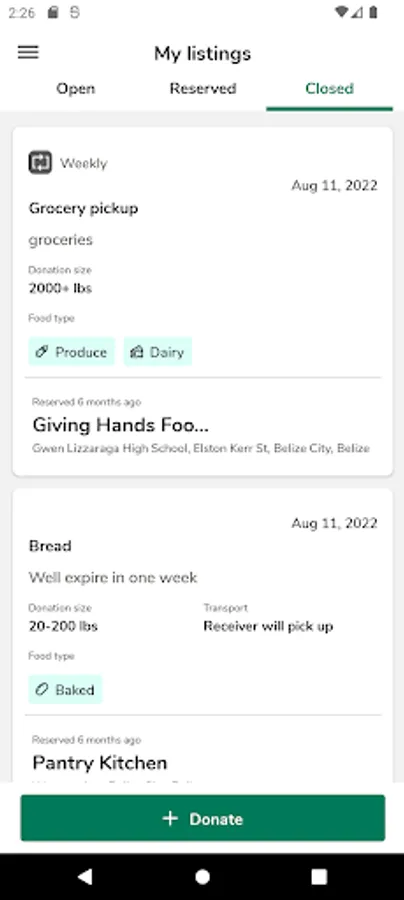 - Create a new food donation: add photos, time, location, whether you'll be delivering or need a pick-up