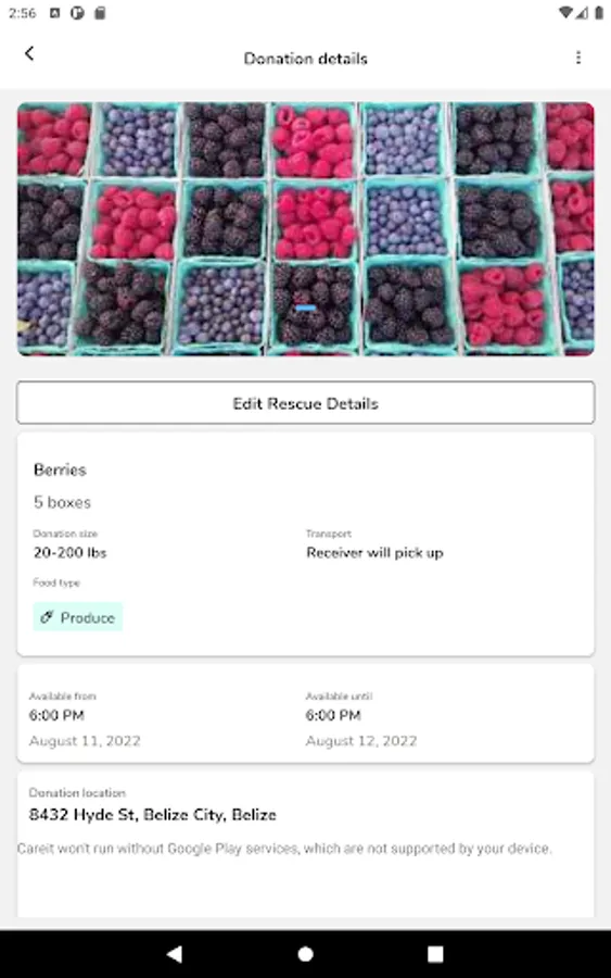 Careit is a food donation marketplace that matches any organization with extra edible food to a nearby nonprofit. Nonprofits find donations in their area that match their food requirements and set up a pickup or drop off with the donor. All donation details are saved for easy record keeping.