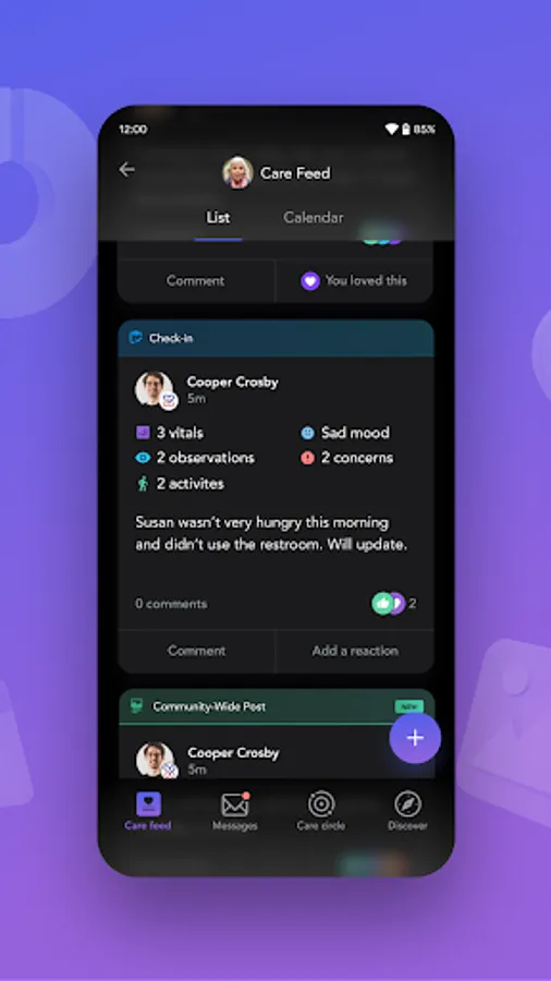 Receive updates from your loved one’s care provider and connect with them in real-time. (Providers must be Carely Pro users in order to use this feature.)