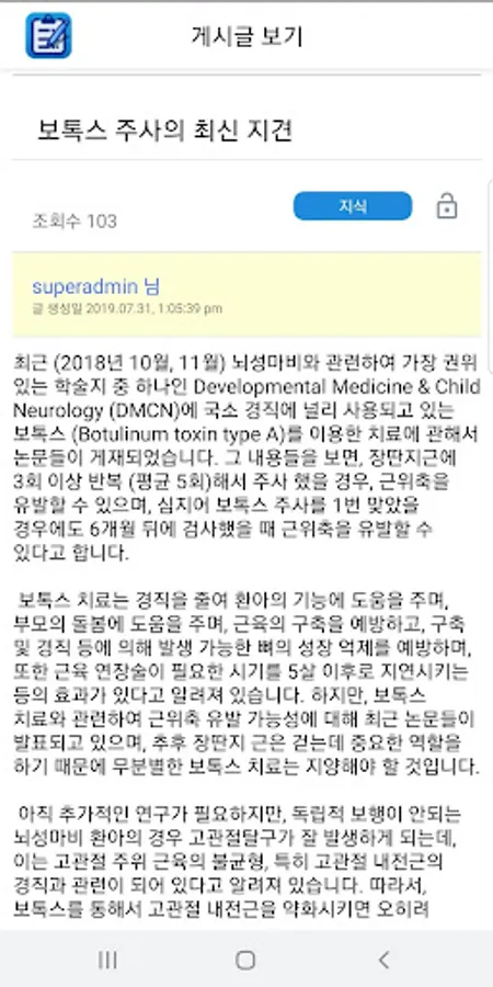또한 설문조사를 마치고 난 후에는 질문 및 답변게시판에서는 환자와 보호자 분들이 궁금해 하시는 질문들에 대해 전문적인 답변을 드리게 되며, 지식게시판에서는 뇌성마비에 관한 새로운 정보들을 제공해 드립니다. (단, 질문 및 답변게시판에서는 처방전, 진단 등의 원격진료에 해당하는 정보가 아닌 범위에서 답변해 드립니다.)