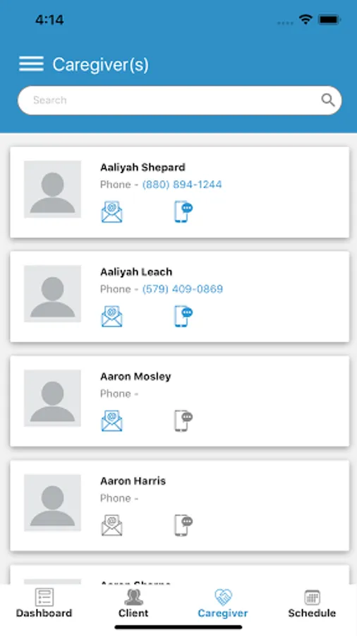 Caregiver list along with ability to send email or message