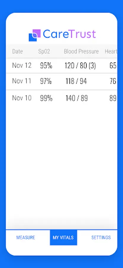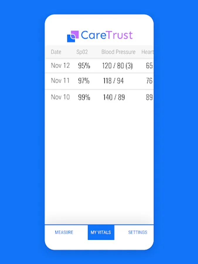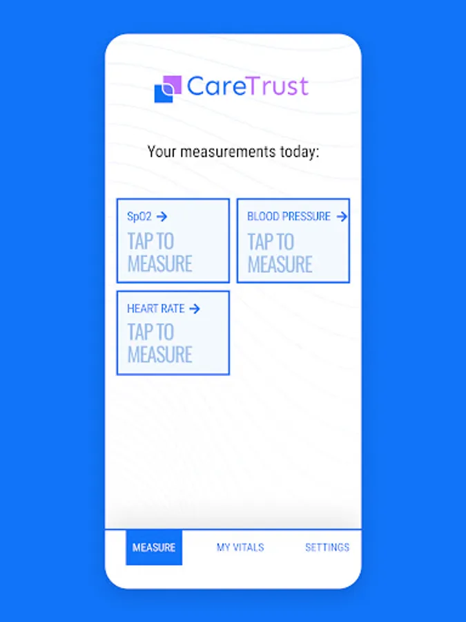 CareTrust is a remote patient monitoring service that allows monitoring your vitals from the comfort of your home.To collect your vitals, the CareTrust app works with compatible FDA-cleared monitoring devices.