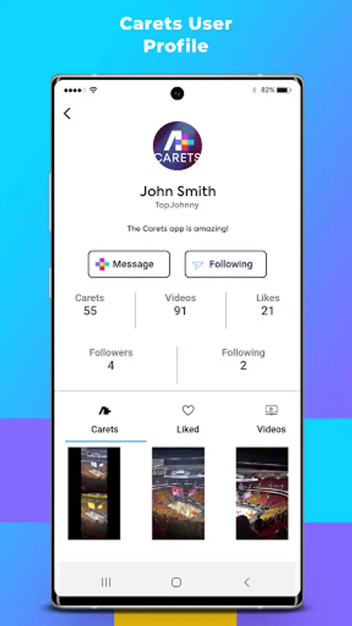 Follow other app users. You can follow individual users and easily view their individual content and Caret Videos that include their video content. You can also message these users within the app.
