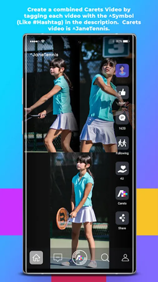 Watch video content. The app enables you to view single videos and Caret Videos that have been created by you and your fellow app users. Watch Caret Videos created by multiple users. Search by description including ^Carets, #hashtag, and @user.