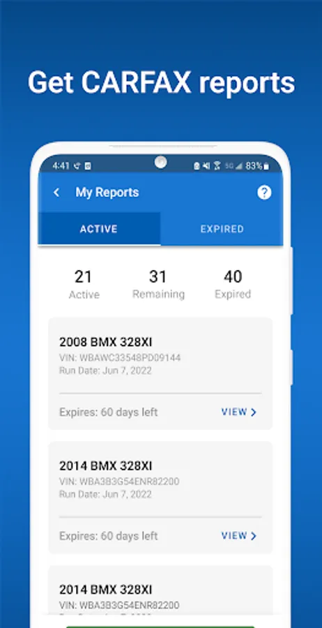 If you need to run a CARFAX Vehicle History Report, this app makes it easy. Just enter the car’s vehicle identification number (VIN) or license plate and get the CARFAX Vehicle History reports you need. Buy a CARFAX Vehicle History Report plan at carfax.com and use them in the app.