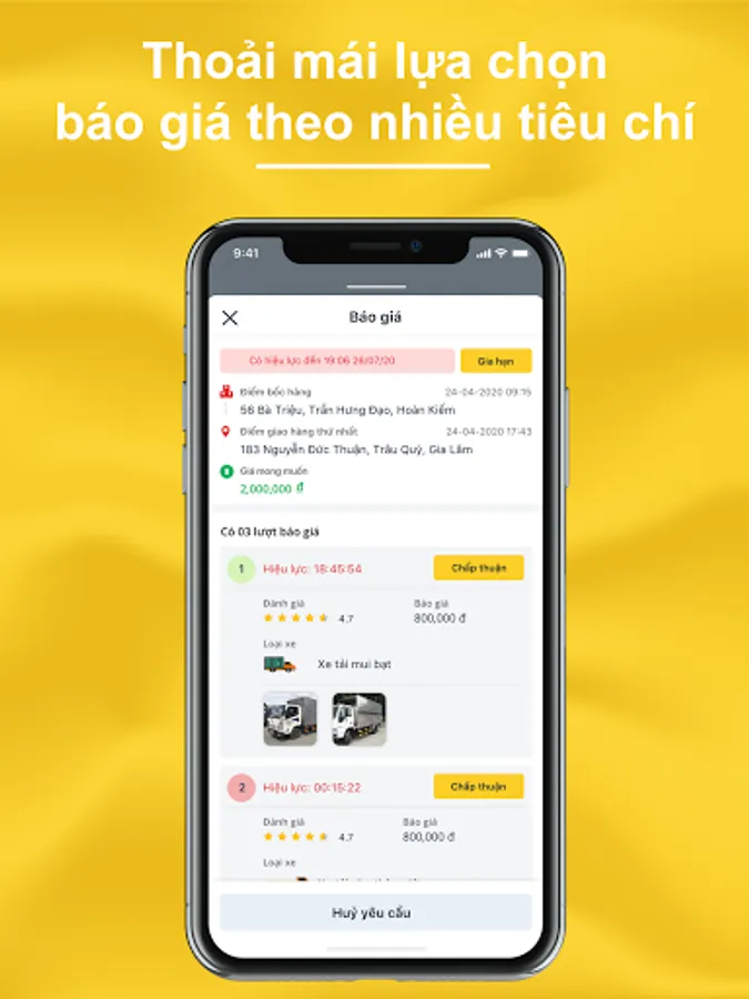 - Quickly receive a quote and choose a truck based on desired criteria: price, truck type, quality, ...