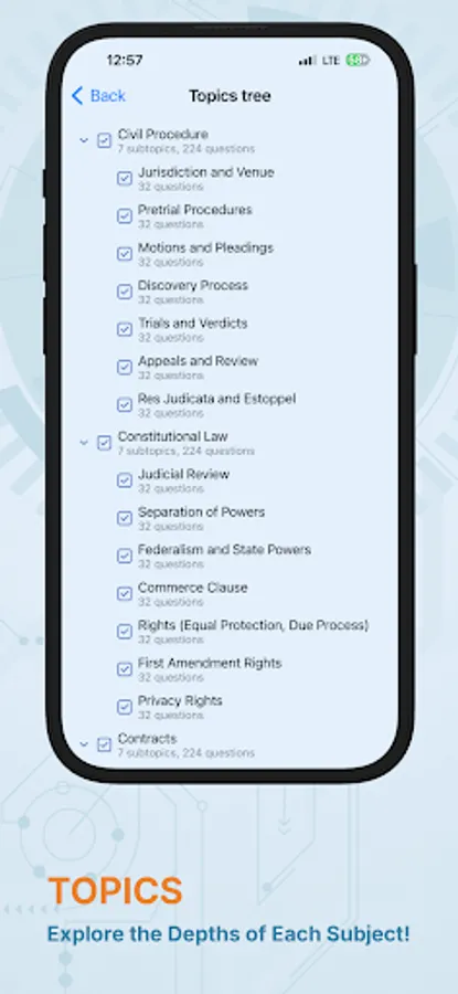 Tailor your study sessions to target specific areas of law, whether it’s navigating constitutional complexities or refining your grasp on civil procedure. Track your progress and refine your strategy, ensuring you’re fully prepared when it counts.