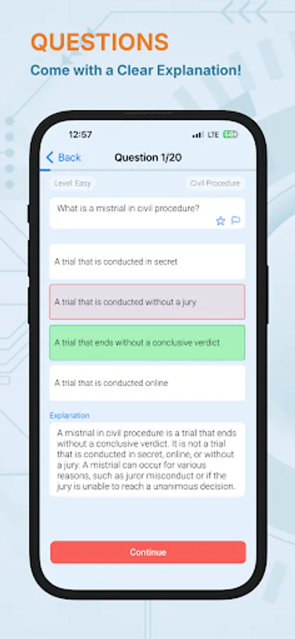 With expertly designed questions covering all critical areas, including Constitutional Law, Criminal Law, Contracts, and Evidence, our app ensures you’re ready to address even the most challenging legal issues. Each question is accompanied by in-depth explanations, empowering you to sharpen your reasoning and enhance your understanding of key legal doctrines.