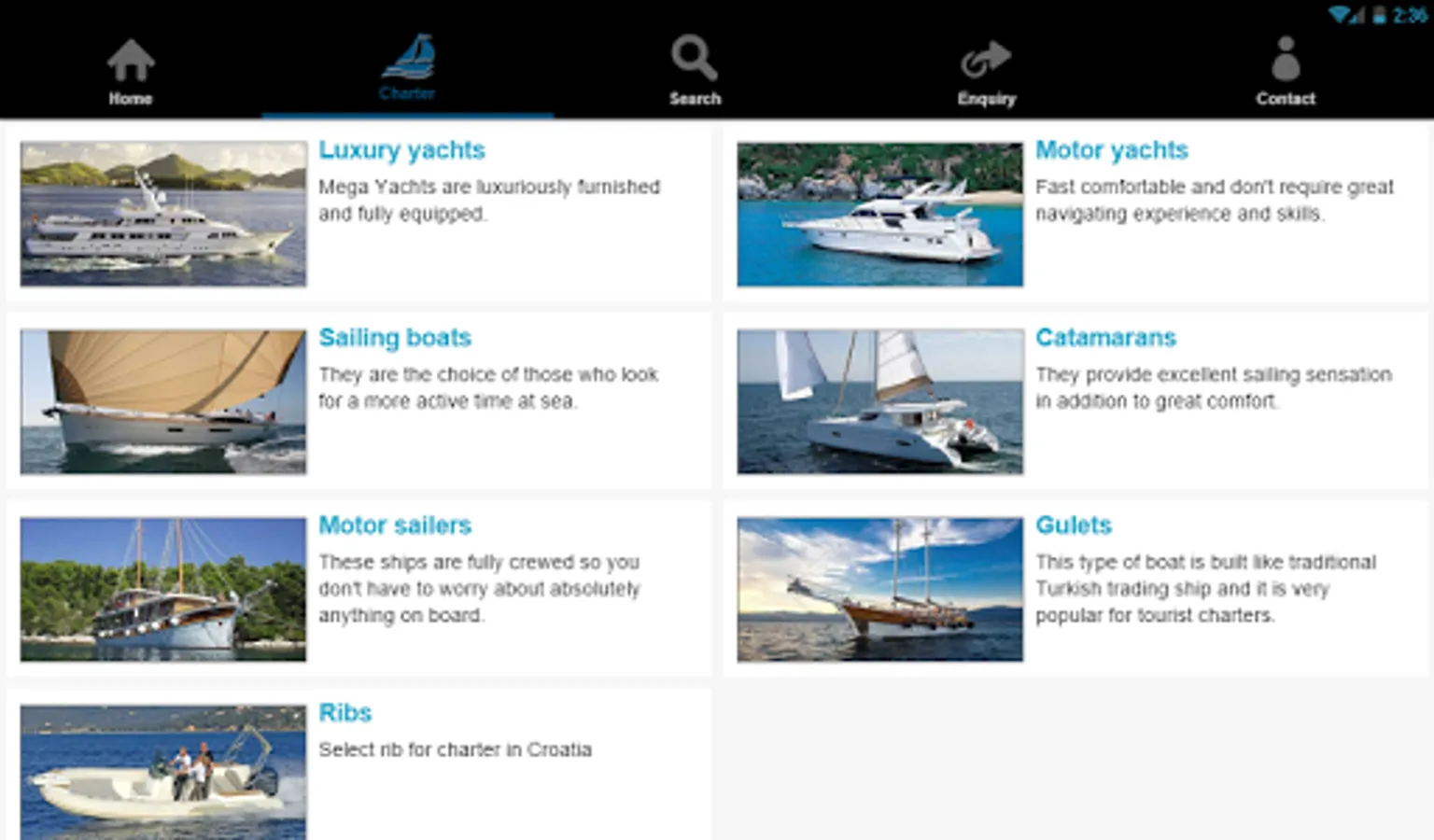 - Presentation of luxury, motor yachts, sailing and catamaran yachts by type