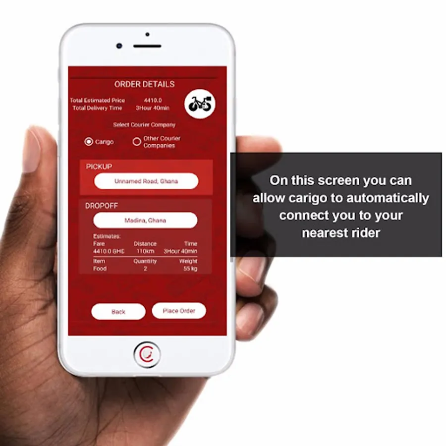 Tired of calling and searching trying to find a delivery company to move your goods? search no more. Carigo is a platform that serves businesses and individuals with their delivery needs in a smart, secured, convenient and cost-effective manner. The platform provides the cutting-edge technology that empowers businesses and individuals move any type of goods (small, medium, large) using a smart device in total satisfaction. With Carigo, users exercise total control of their delivery needs with the ability to track orders, make multiple deliveries with a single order, choice of service providers ,choice of vehicle type (Motor, trucks, vans, cars) and freedom to choose any form of payment (cash mobile money and credit card).