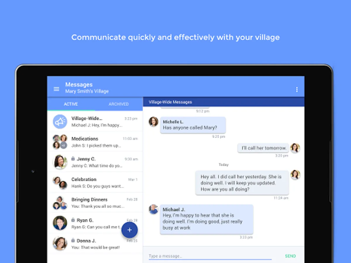 With Caring Village, families can keep their personalized village informed about a loved one, put tasks and communication into action right away, share responsibilities, and have full control and transparency over their loved ones’ well-being at all times.