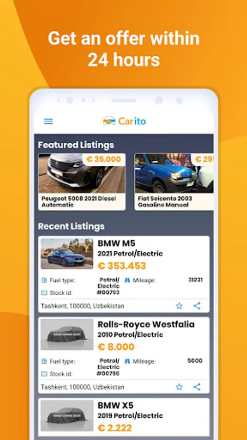 Carito.com app offers clear search criteria and filter options to find your dream vehicle at a fair price. Benefit from the wide selection of used cars, new cars, motor homes, and motorbikes.