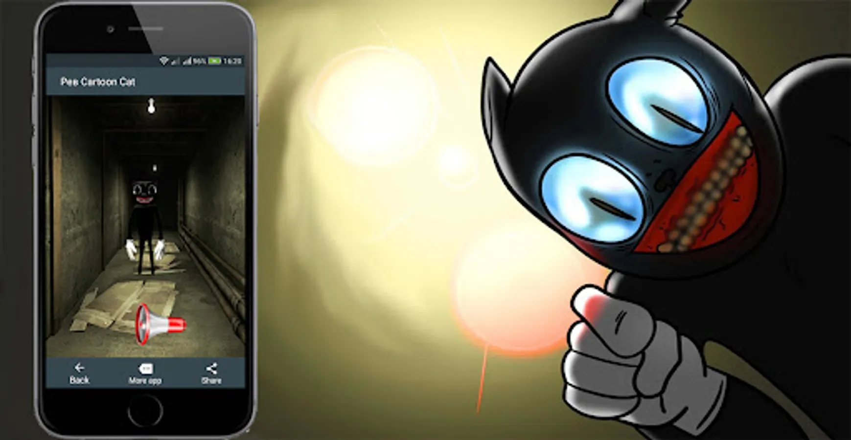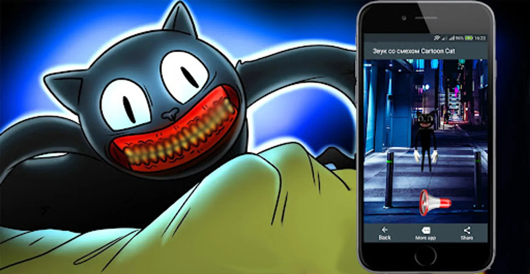 This super funny app will appeal to fans of prank and prank horror style and hear how the most dangerous cat makes terrible sounds. The app contains frightening sounds that the scary cat makes, such as growling, roaring, hissing, laughing and cartoon cat song. Also in the application there are bright pictures and possible places where a cartoon cat can live. Creepy cartoon cat sounds can be turned on by clicking on the button and playing a friend, like this terrible cat is somewhere nearby, it will be a lot of fun.