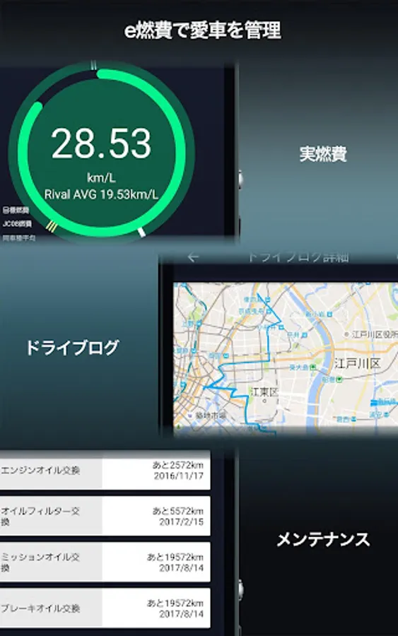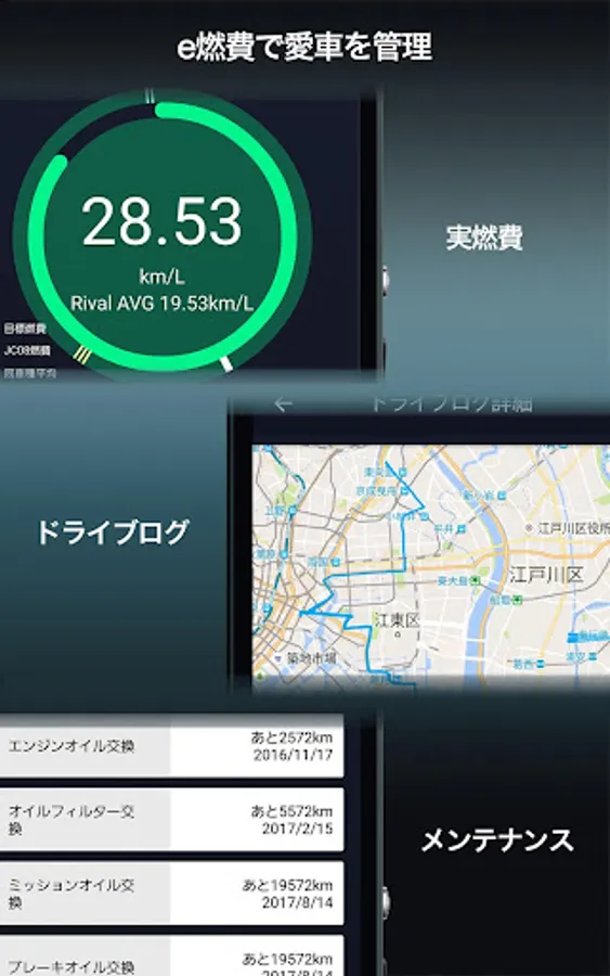 The new e fuel economy, achieving a fuel economy posts by receipt shooting using the smartphone camera. In the manual input, but had gotten to enter the "travel distance (odometer)," "amount of oil", "payment amount", "gas station information", and the input of the mileage in the receipt shooting post, only to shoot a receipt. You will be able to enjoy a more easily fuel consumption management.