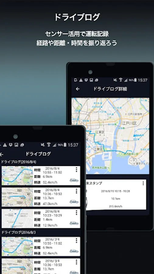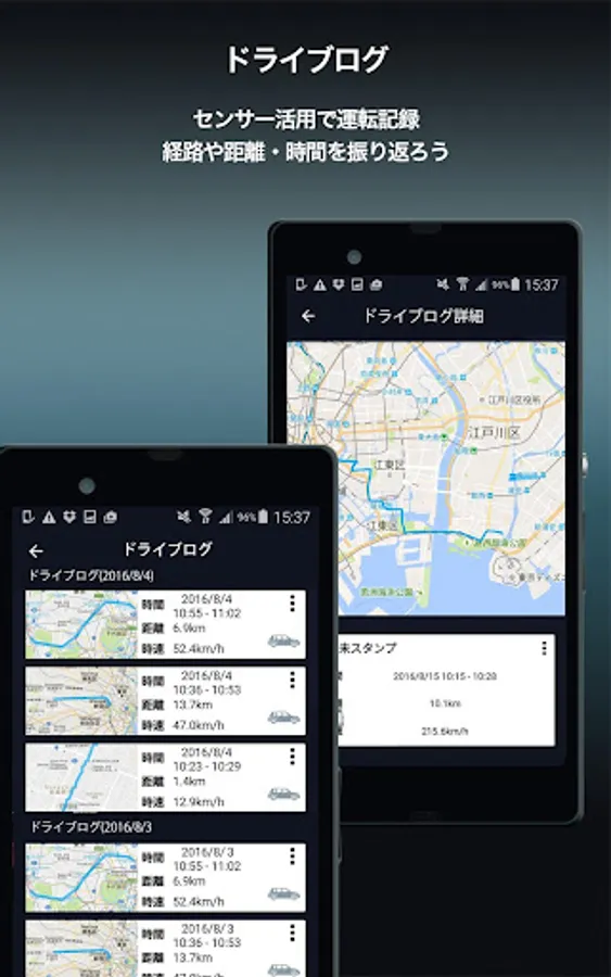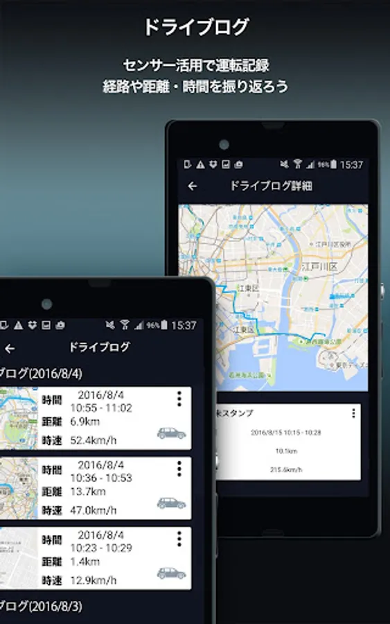 Connection with the retrofit parts and vehicle-mounted device is not needed at all! Only carry around as usual a smartphone, make a record of the drive automatically. Is further moved a summary display in the car by entering the stamp of "dry blog", not only look back on the memories of the drive, it is possible to know commuting route mileage and the time required for the (congestion degree), go a step further but you can take advantage of to improve fuel efficiency.