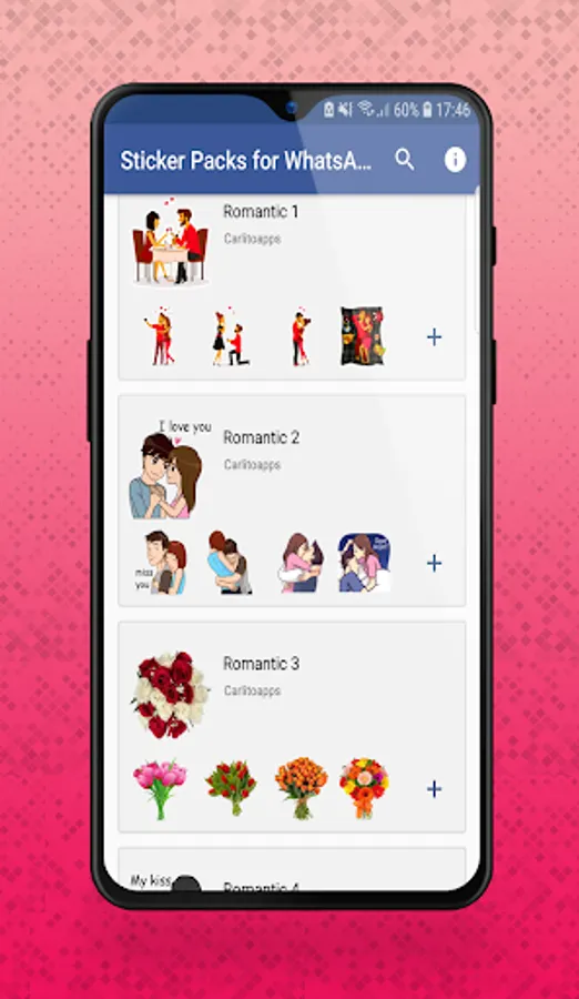 Romantic Stickers is a WAStickerApps that contains a big and Beautiful free pack collections of romantic hugs kisses lovely flowers and more contents for couples. Make your conversations on whatsapp look amazing with these beautiful and lovely romanitc Stickers.