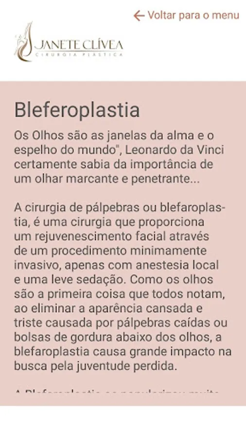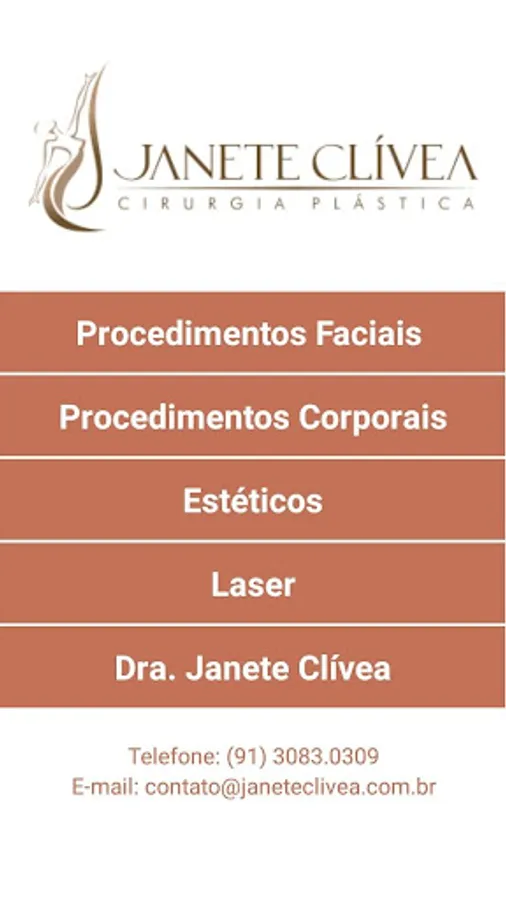Dr. Janete Clívea is Plastic Surgeon - Membra Especialista of the Brazilian Society of Plastic Surgery. His office is located in Belém - Pará and the application has as purpose the patient to know a little of each procedure performed in the office.