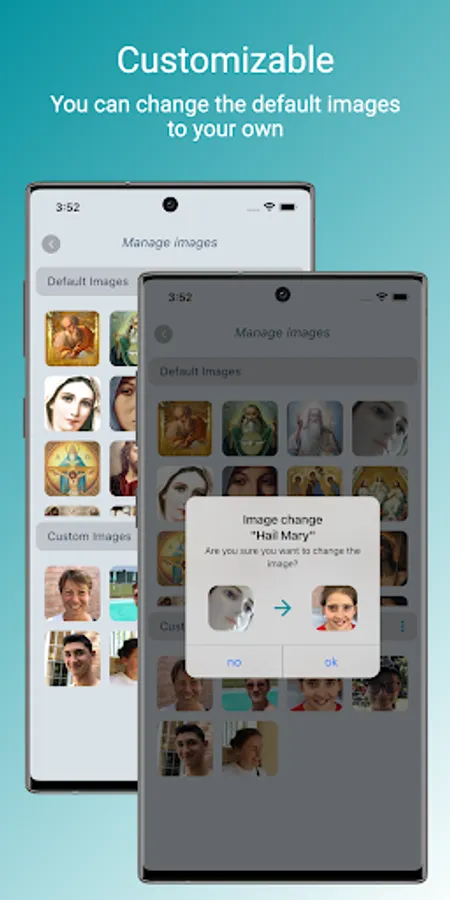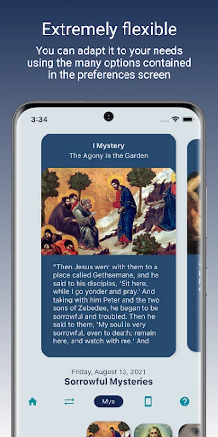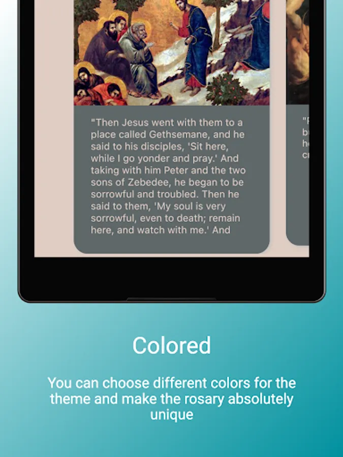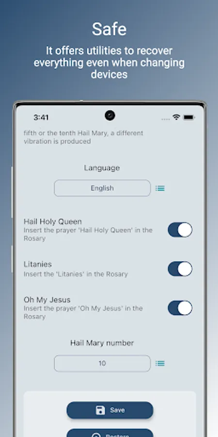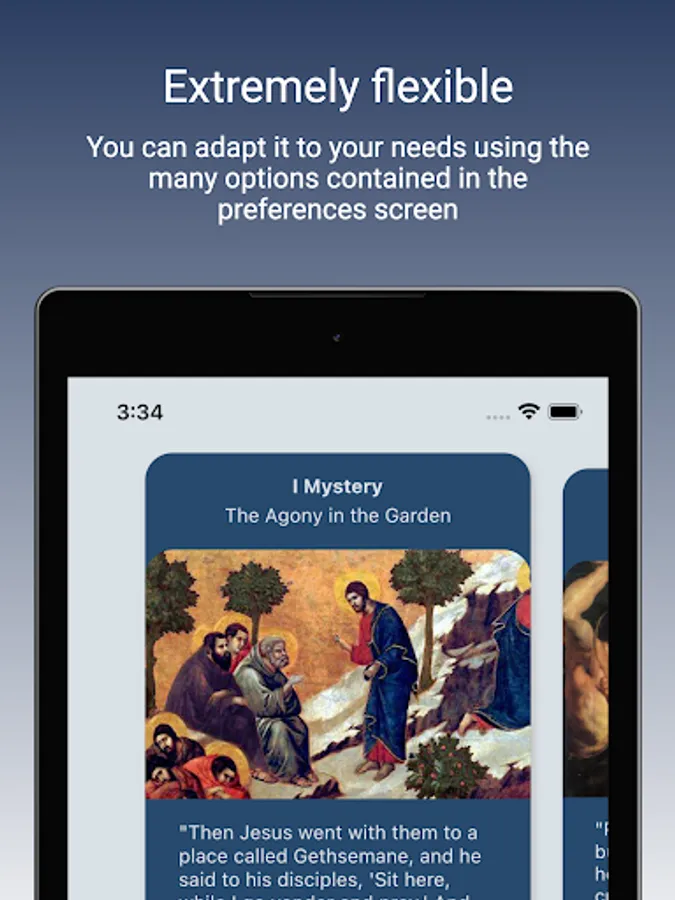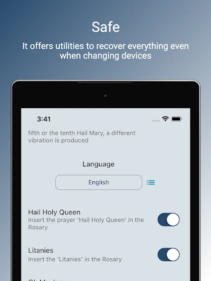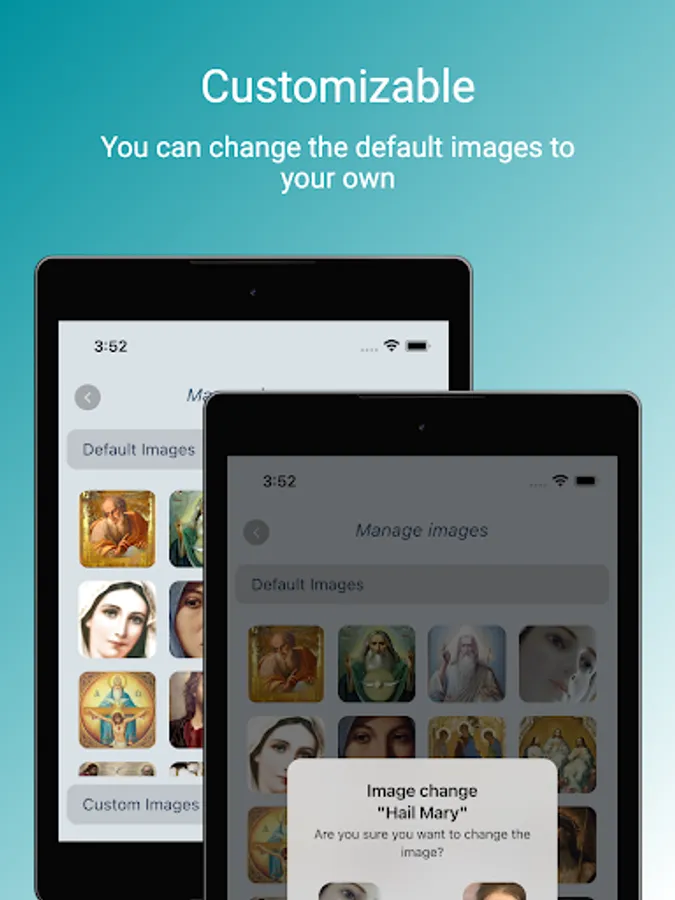 You can make this app unique and absolutely yours, by customizing images, colors, music. You can also choose the number of Hail Mary, whether to include the Hail, Holy Queen or the Litanies. In short, if you meet another person with the same app, they will not be able to say that their app is like yours.