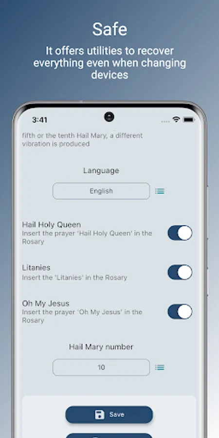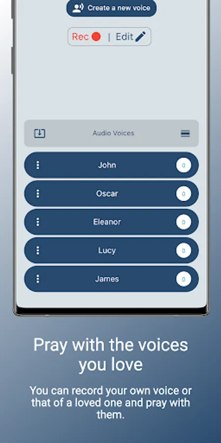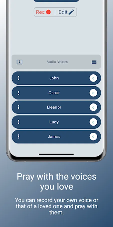 - save the voices of relatives (for all parts of the Rosary, including the mysteries), friends or whoever you want (in any language or dialect you want) and pray with their voice, even when they are not present, feeling closer to them;