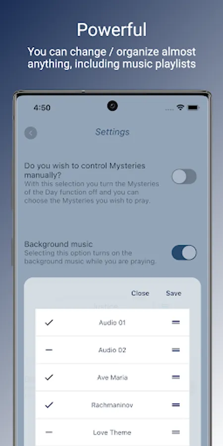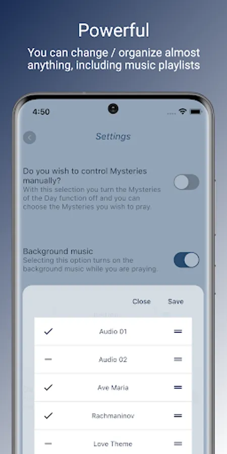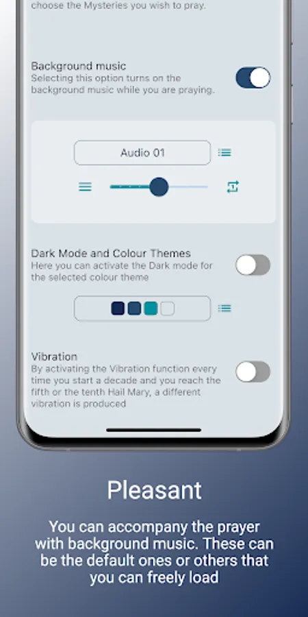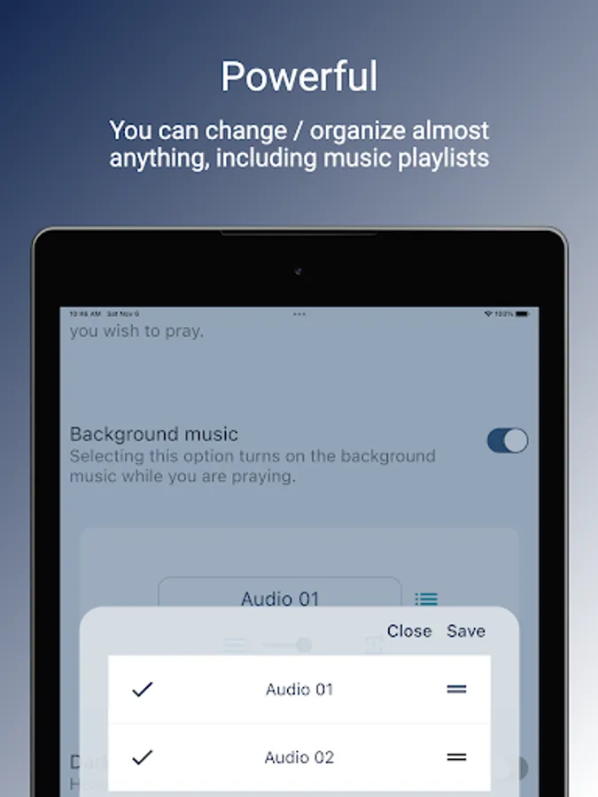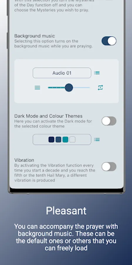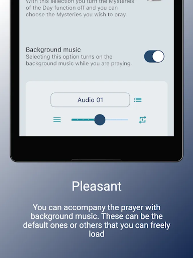 With this app you can pray with the background music you love. In addition to the default music, you can upload your favorite audios that will accompany you in your prayer. You can adjust the volume to your liking, listen to them one after the other in a playlist, rearrange their order ...
