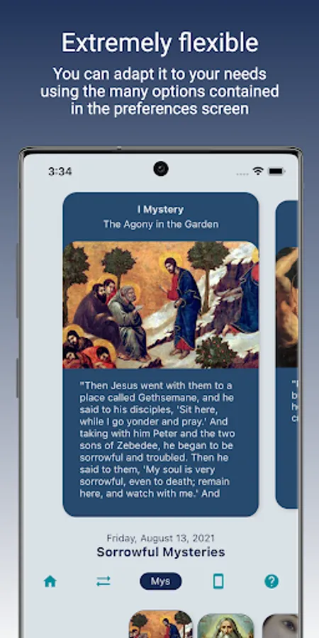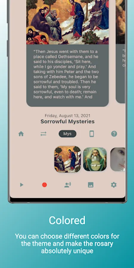 - take pictures or import them from the library and change the default images of both the mysteries and the Rosary;