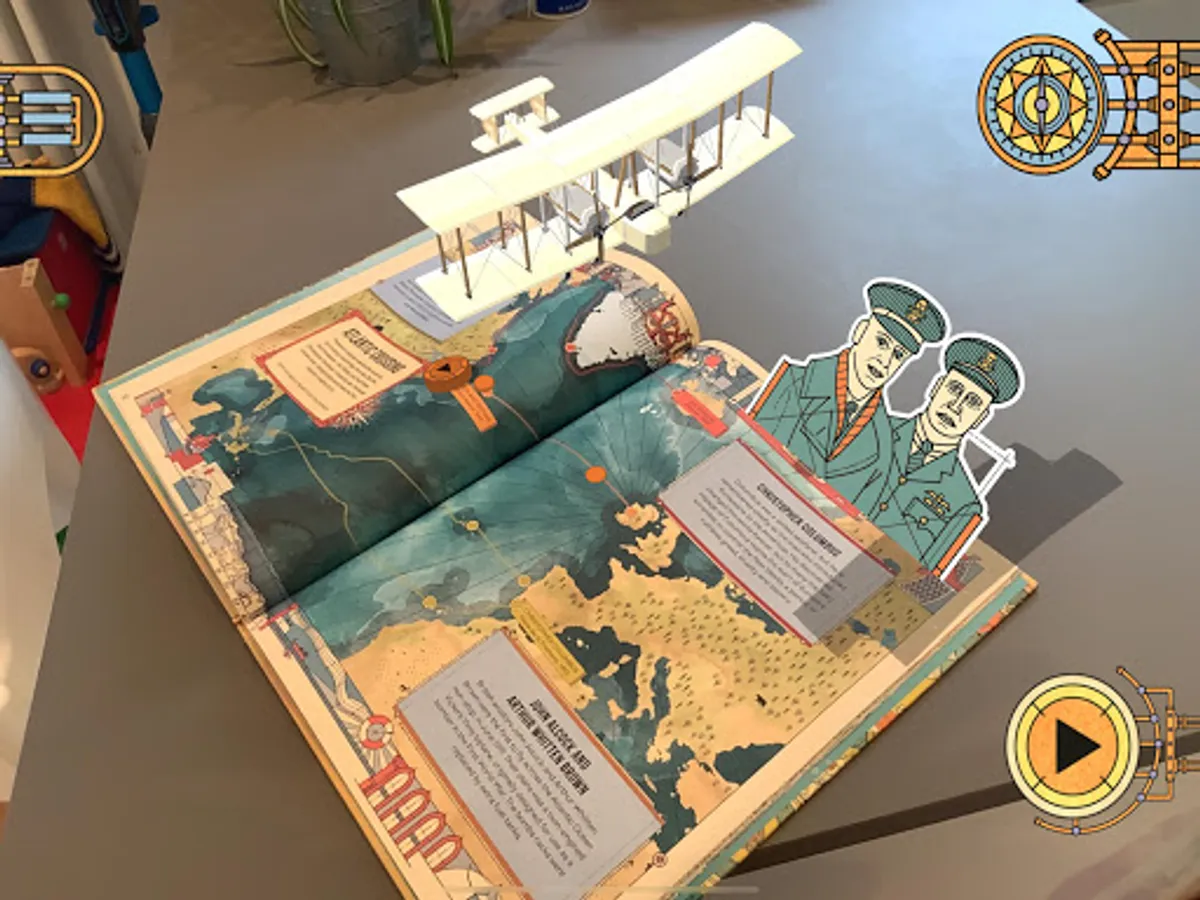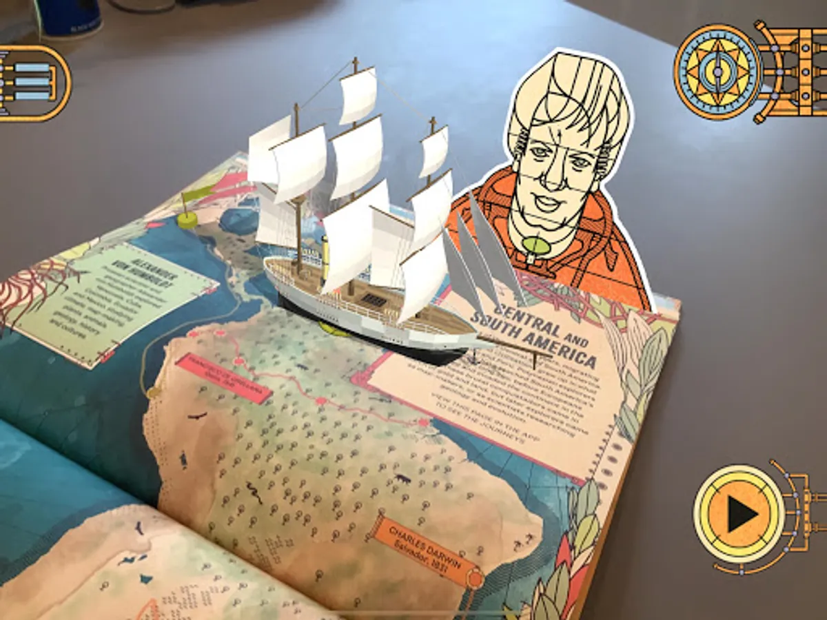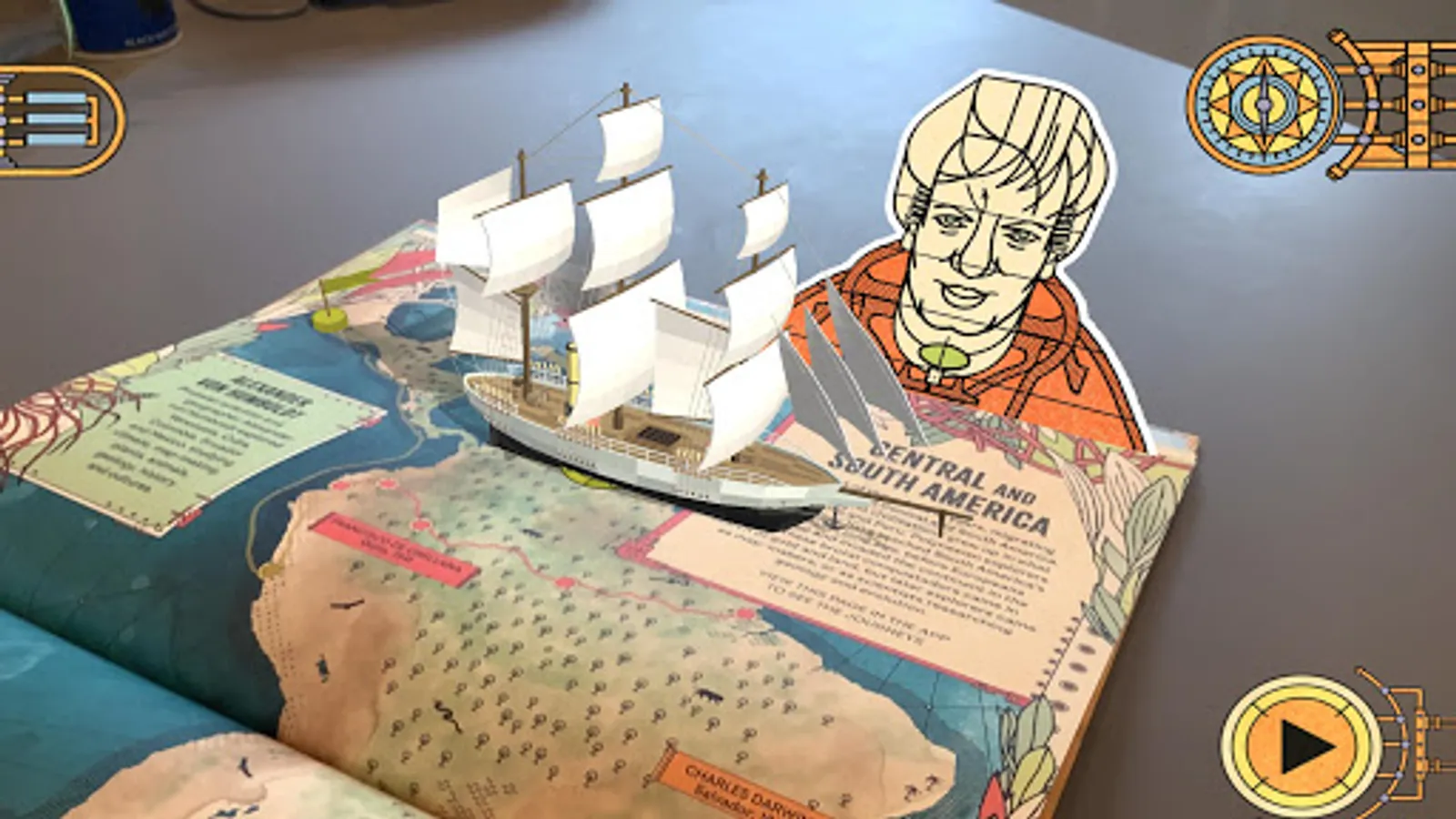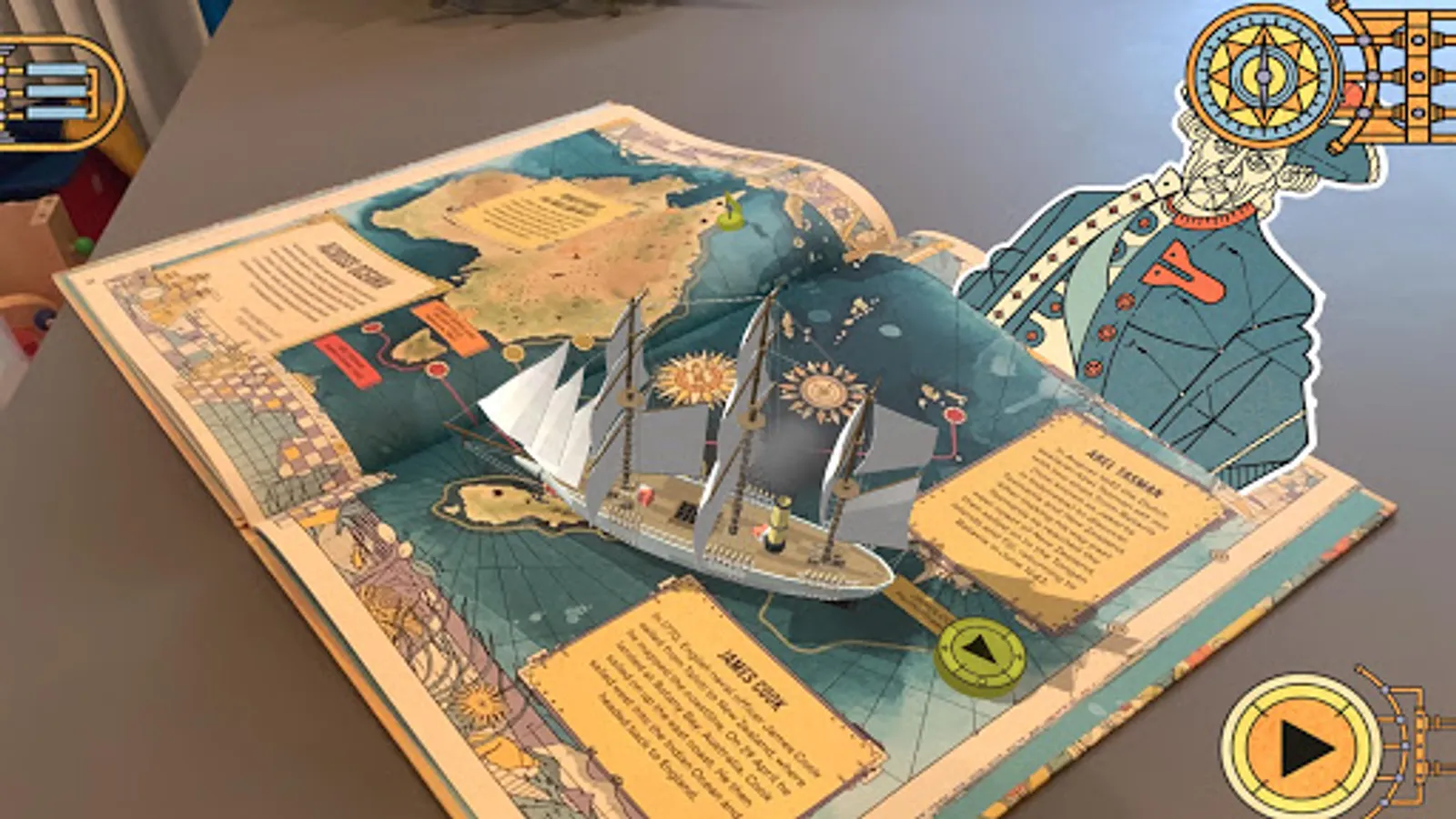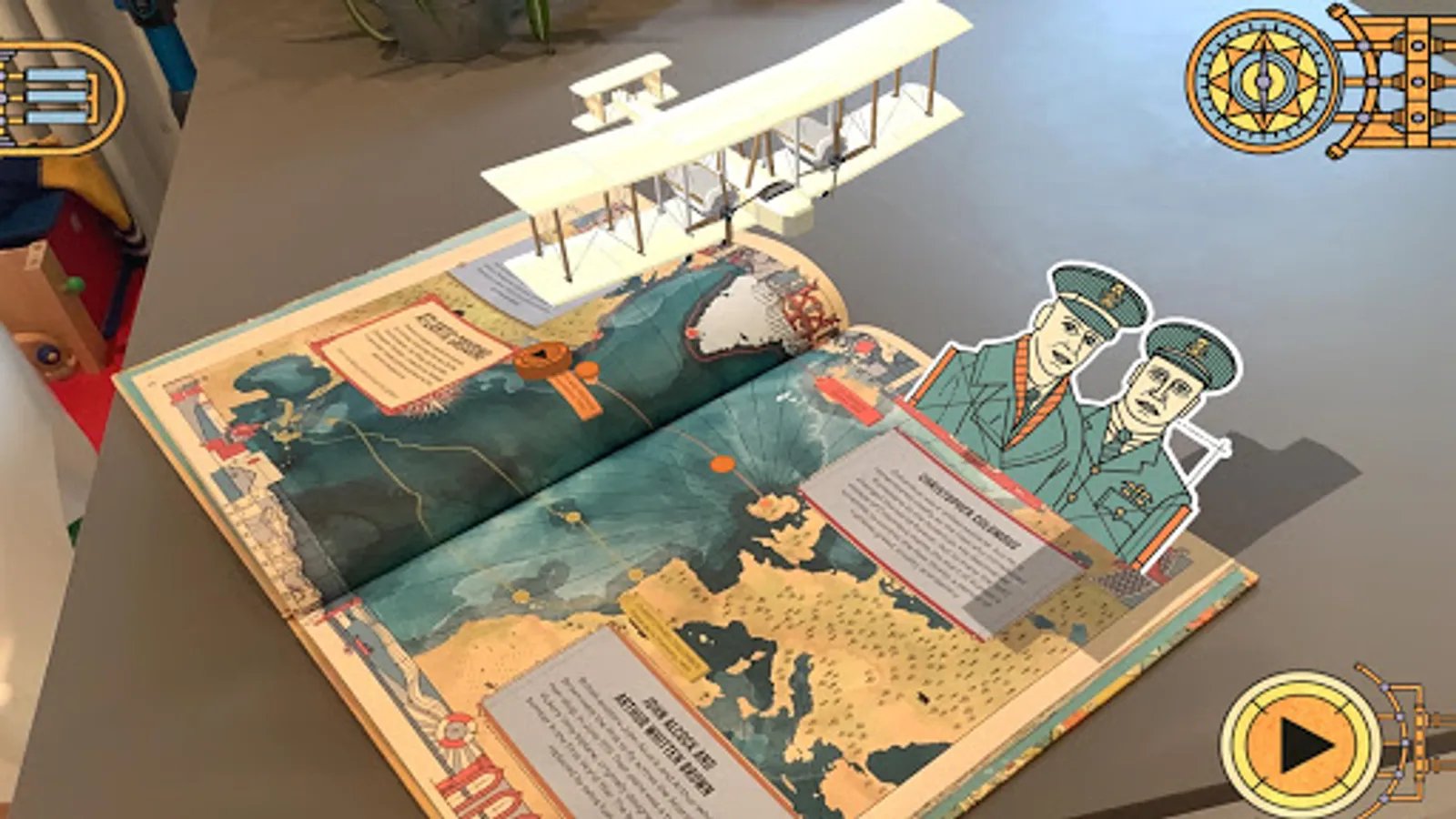 Once you press the play button on the app’s opening screen, simply look at the map pages of your Atlas of Great Journeys book through the app, and follow the on-screen instructions.