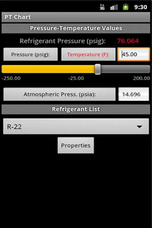 The "HVAC PT Chart" is an electronic pressure-temperature calculator that allows HVAC technicians and contractors to quickly lookup the temperature and corresponding pressure for 75 common HVAC refrigerants.