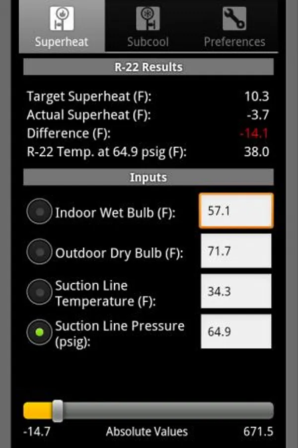2. Perform subcool refrigerant charge calculations for 75 different refrigerants. Input the indoor wet-bulb and outdoor dry-bulb temps. to get the target subcool temperature. Then, specify the liquid line temperature and pressure to get the actual subcool temperature. The difference tells you whether to charge or not.