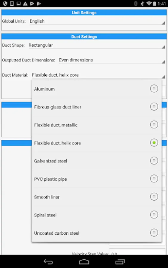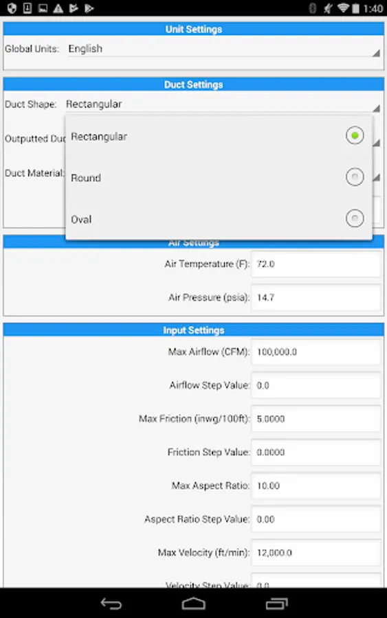 You can specify additional parameters such as the duct shape (rectangular, round, or oval), the air temperature and the air pressure. You can also choose to display values in either English (IP) or Metric (SI) units.