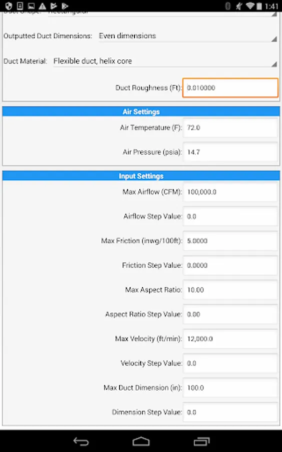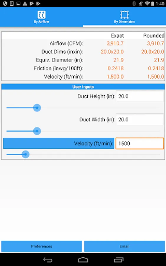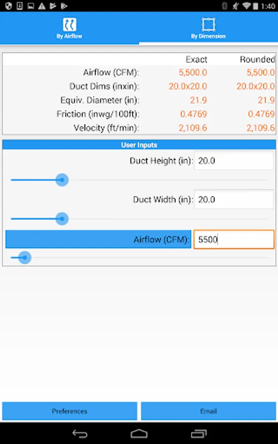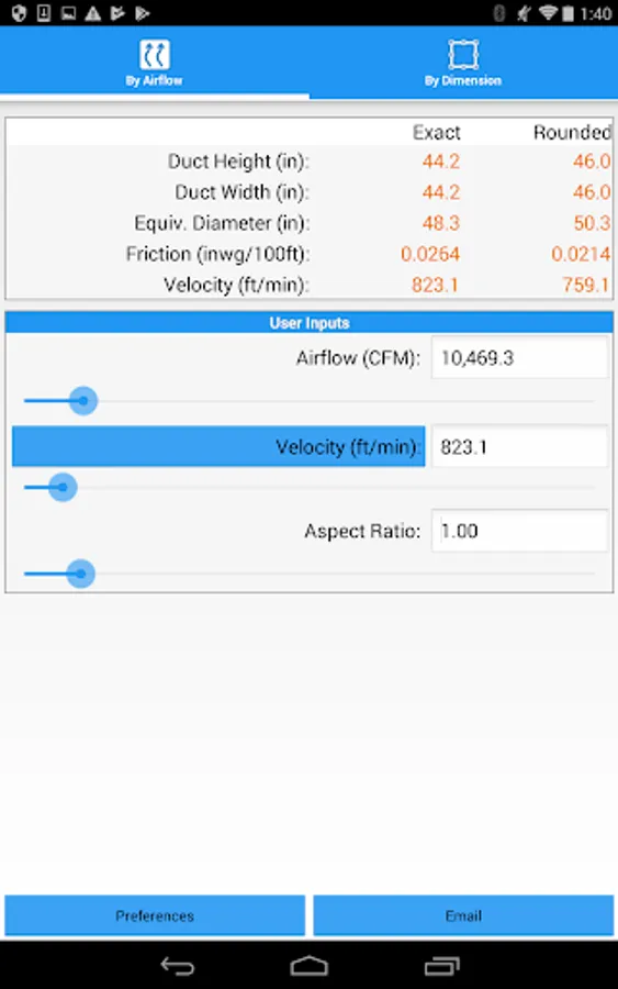 In the "Size by Airflow" mode, you can specify the total airflow in CFM (or L/s), the aspect ratio and one of either the velocity of air or the friction loss per 100 feet (30 meters). The results include both the exact and rounded height and width (or diameter) dimensions and the calculated velocity and friction loss.