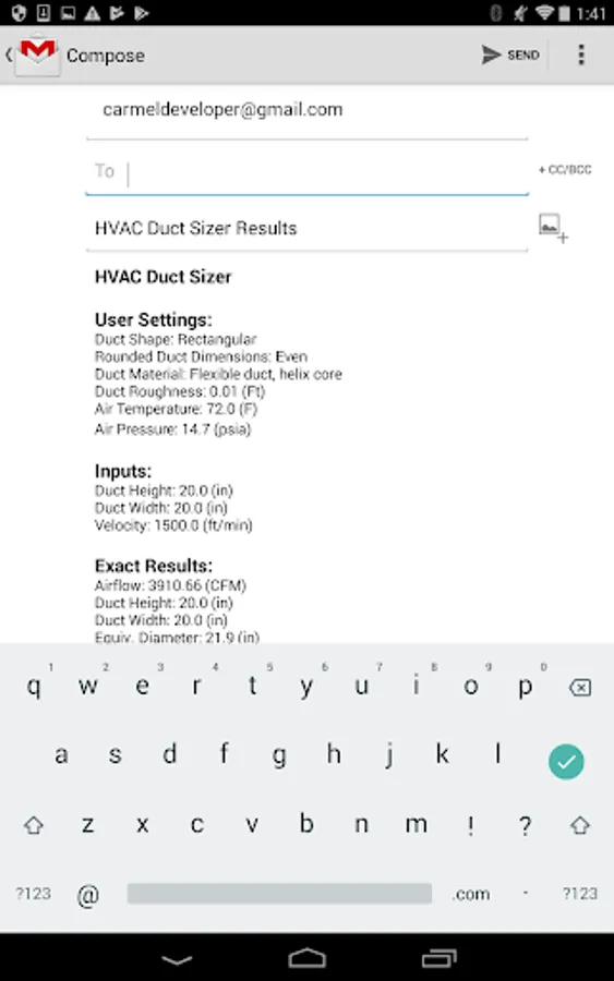 Finally, you can email all of the inputs and results from all 3 input modes to perform further analysis using your desktop computer. The email includes HTML text and a .CSV attachment that can be imported into any popular spreadsheet.