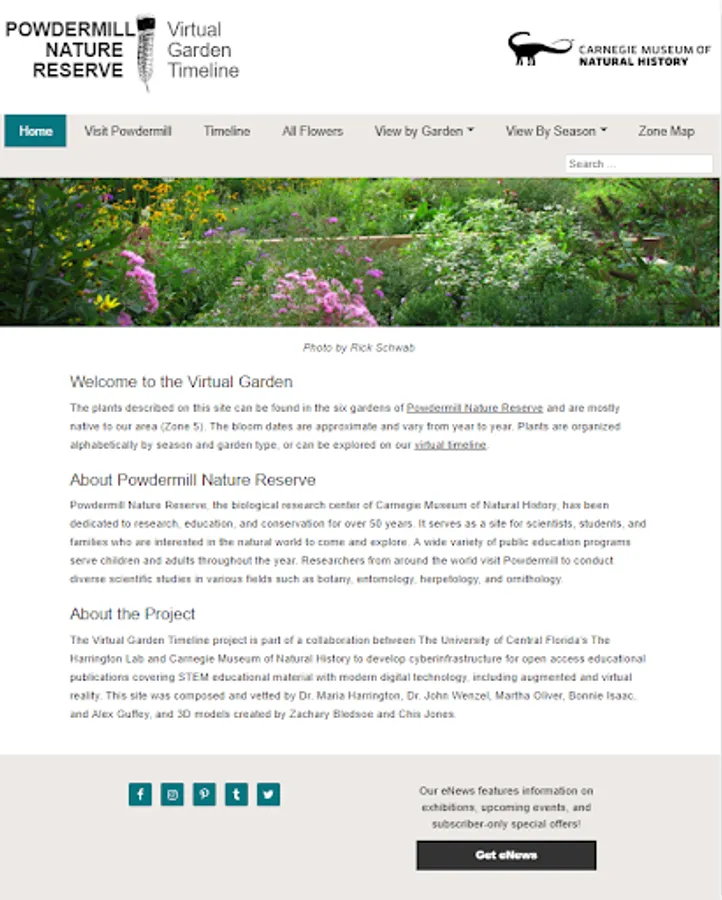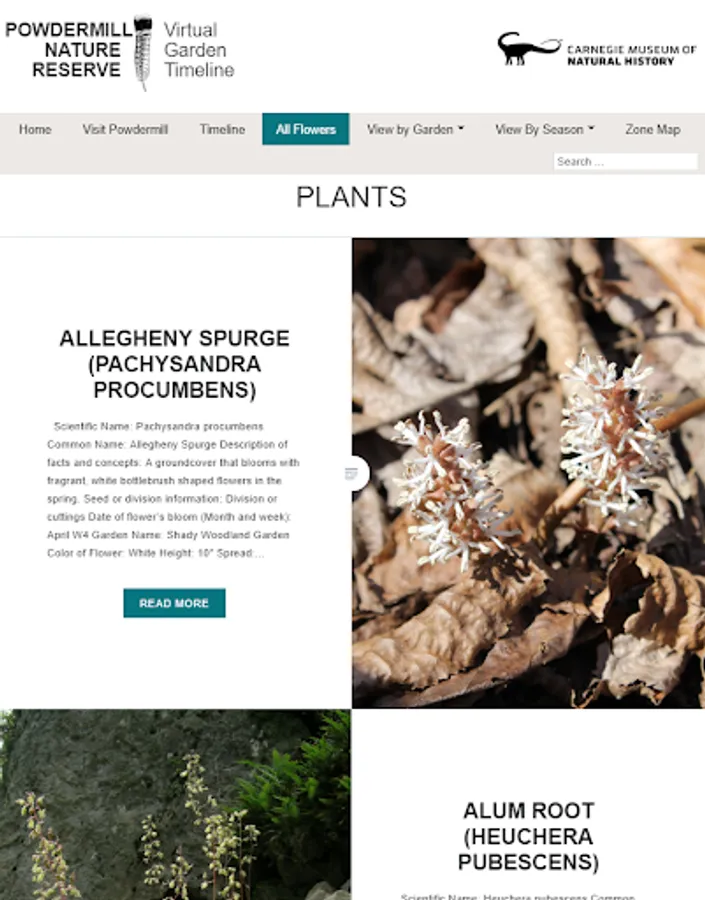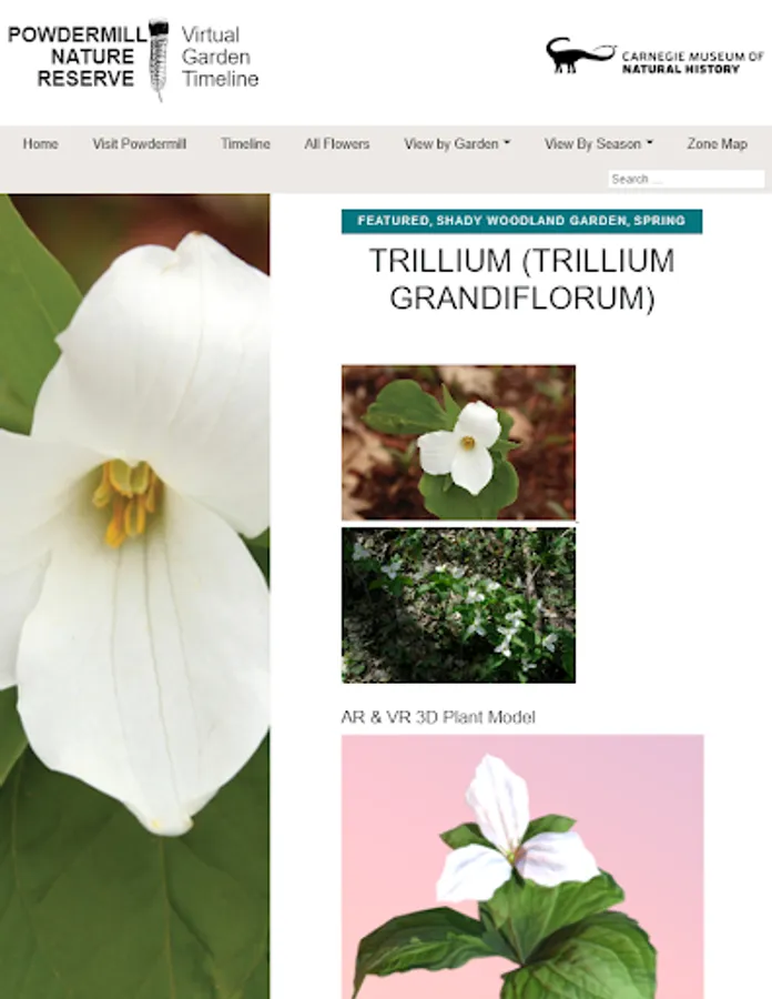 Carnegie Museum of Natural History is located in Pittsburgh, Pennsylvania and is one of the four Carnegie Museums of Pittsburgh. The museum is an active research institution with an environmental research center in Rector, Pennsylvania called Powdermill Nature Reserve. The AR Perpetual Garden App and The Virtual Garden Timeline website features flowers and plants that may be found in many of the gardens at Powdermill and other Appalachian areas in the US.