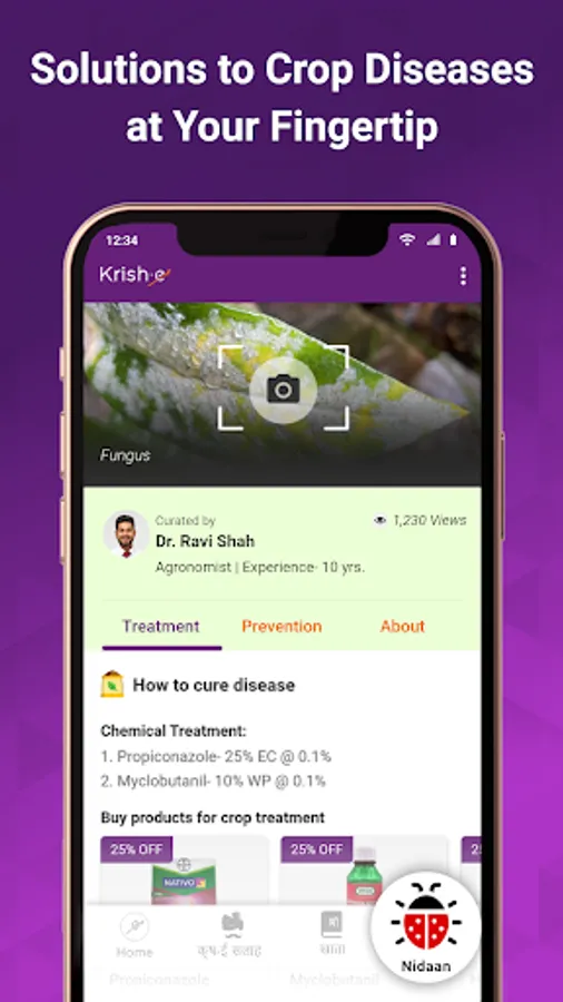 By uploading a clear photo of the affected area of the plant, the Nidaan feature of the app is a helpful tool that can assist farmers in diagnosing plant diseases and receiving immediate solutions. The Nidaan feature offers you the appropriate diagnostic and rational treatments, making it the ideal health companion and protection (fasal suraksha) for your crops.