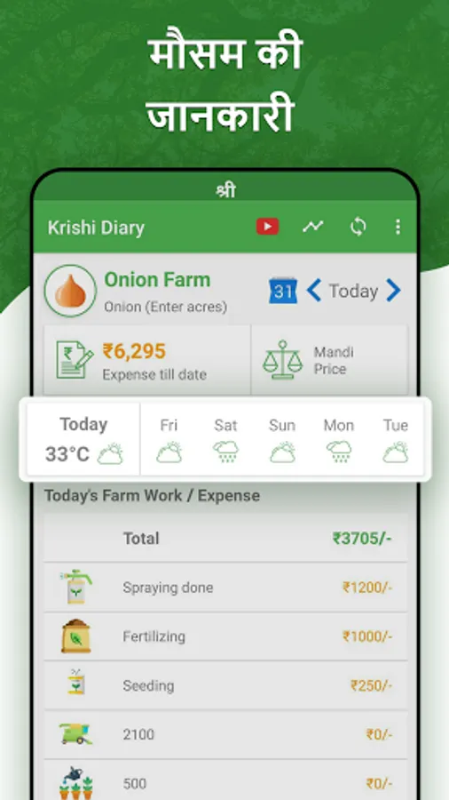 Download the Krishi Diary App & manage all your hisab kitab like a business. Kishi Diary App is suitable for all the crops (Fasal) cultivated on your farm (Khet). By using this one Krishi app, you can get important information like Mandi bhav, Weather conditions, expenses on sowing, fertilizers, pesticides spray, irrigation work, labor work, tractor work, etc.