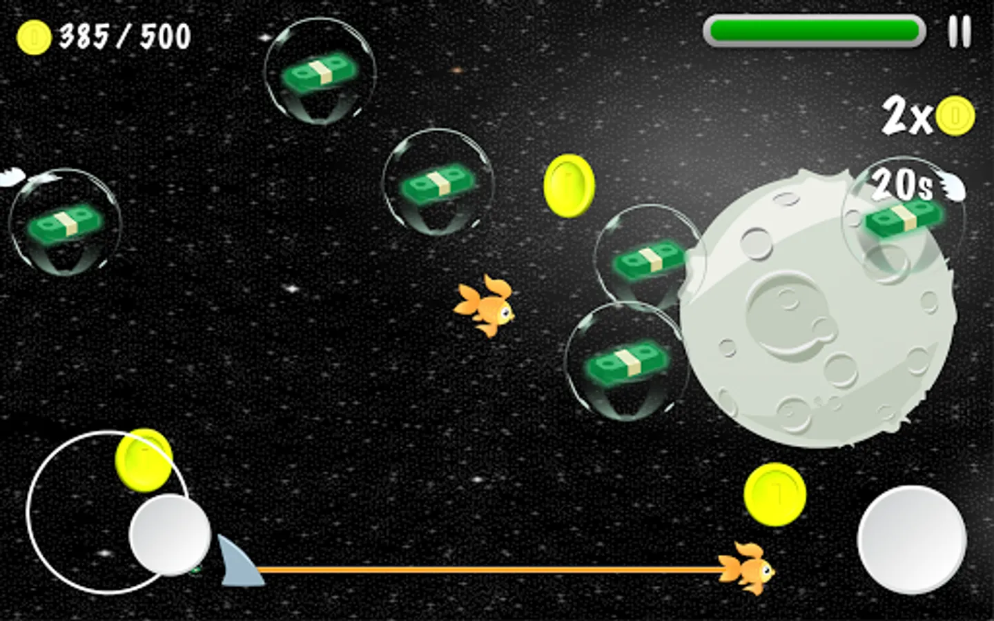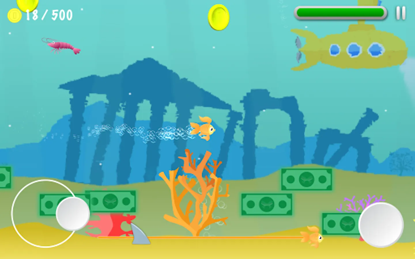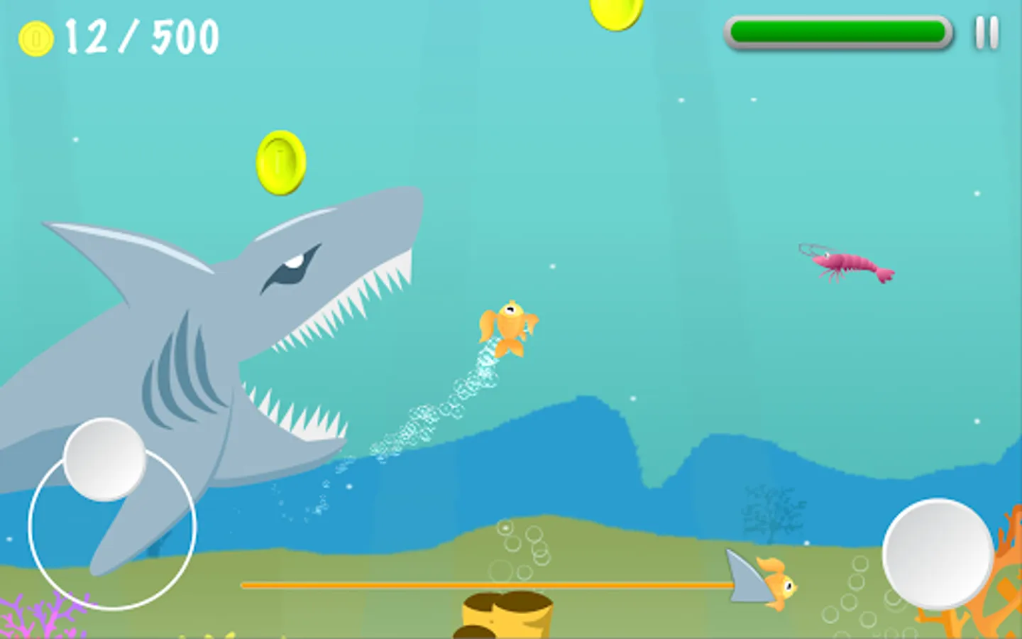 You start your journey as a quick little goldfish with the shark chasing you. Collect coins, bills and jewels to evolve your character bigger and stronger. Unlock all characters to become the king of the seas!