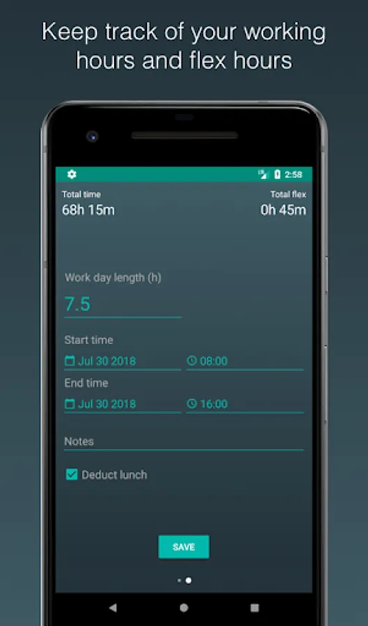 WorkTime keeps a count of your total working time and flextime/overtime. You can deduct lunch time or add notes to your day.