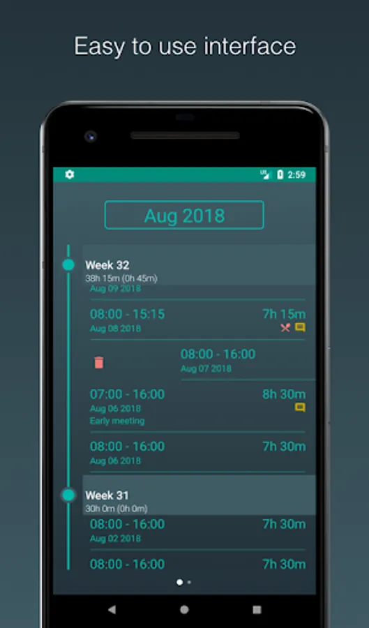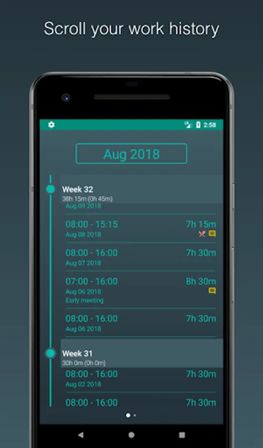 Scroll through your work time history in a breeze using the WorkTime timeline! From the timeline you can see exactly how many hours you have worked weekly.