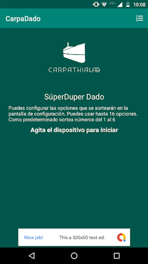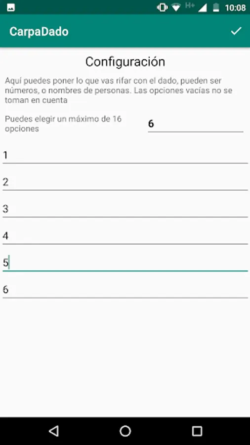 CarpaDado is a simple application that gets a random response. It works just like a die, but you can set the faces you have, up to a total of 16. You can put numbers, legends, names, whatever, shake your phone and it will give you a random choice. Ideal for board games, and moments of indecision.