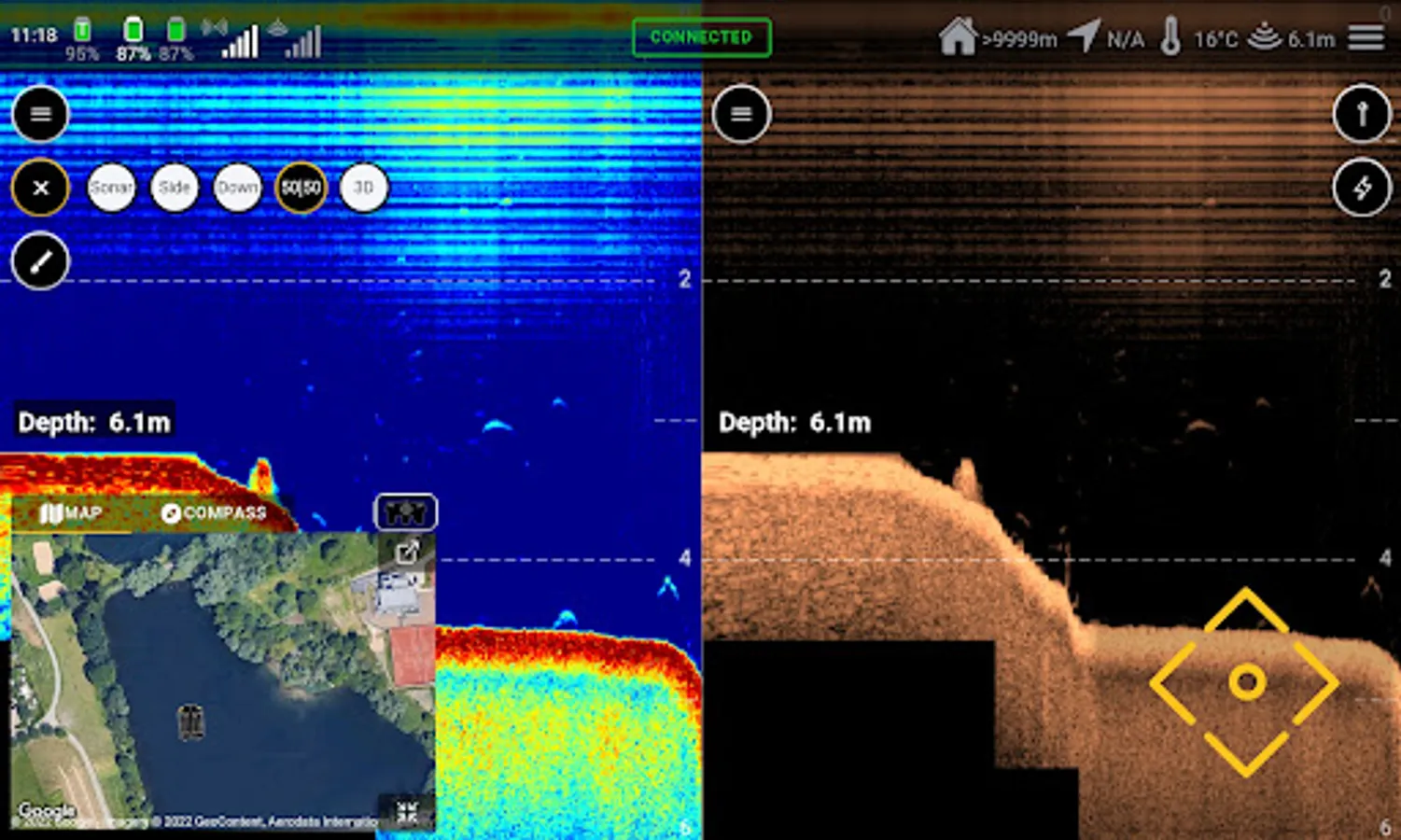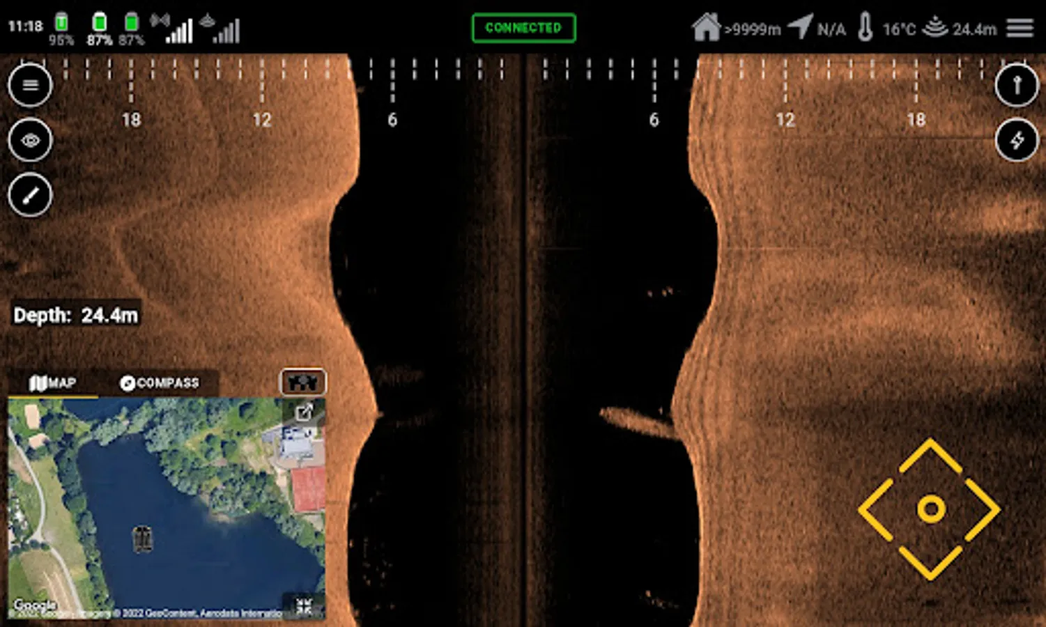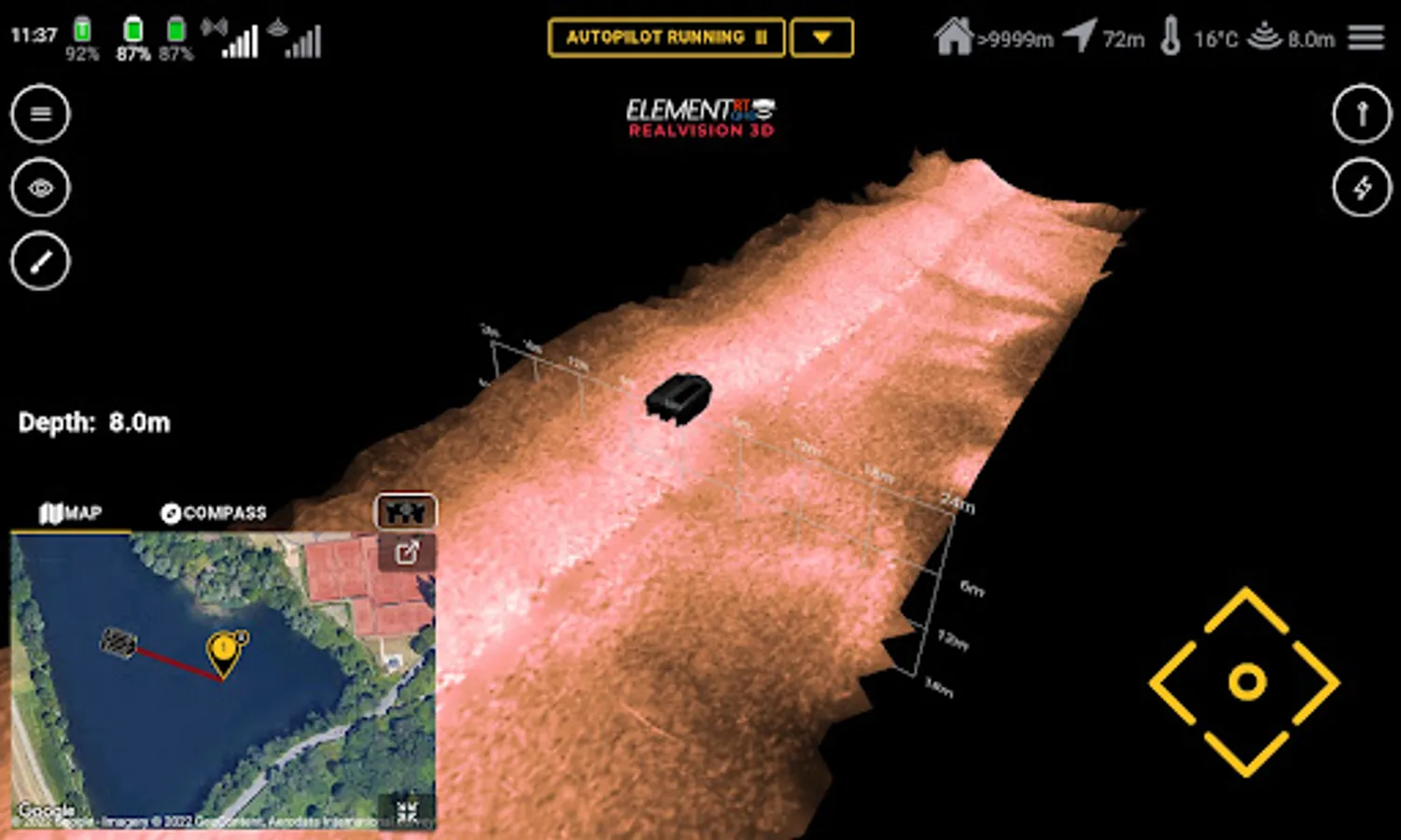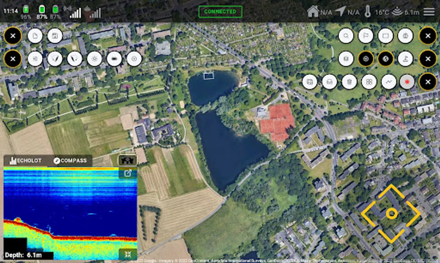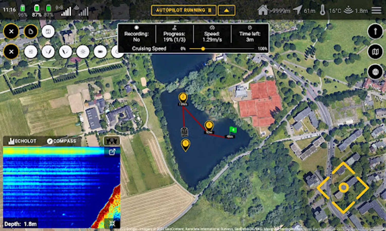 Instead of a normal remote control of our BaitBoat, the Carplounge Autopilot uses an Android tablet/phone. The necessary software is available for free in the Google Playstore and can be used on any Android device with Bluetooth. The tablet is connected to the boat via Bluetooth with a transmitter box and can now control it completely via the touch screen. In manual mode, the boat can be used like a normal BaitBoat and steered via the touchscreen. The position and route of the boat, as well as orientation (compass function!) are displayed on the map and continuously updated. In addition, promising fishing spots, which were found with the help of the echo sounder, can be saved and named via the built-in GPS, e.g. "jetty left", "spot 1", "home", etc.