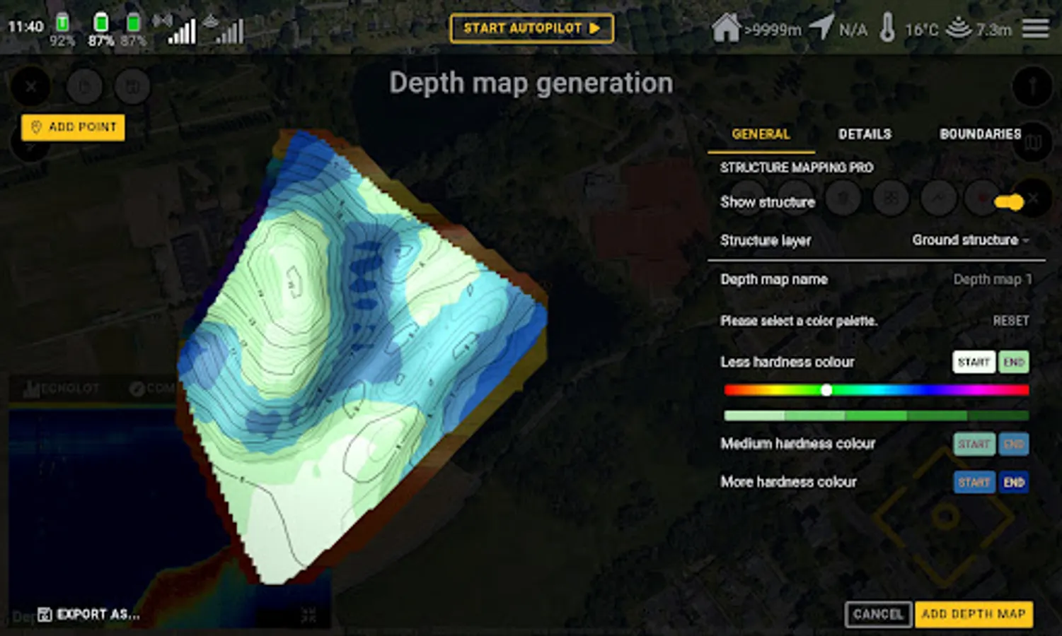 In autopilot mode the points can be selected and combined to a route with corresponding actions (left hatch open/right hatch open/left release open/right release open/ turn on lights...).